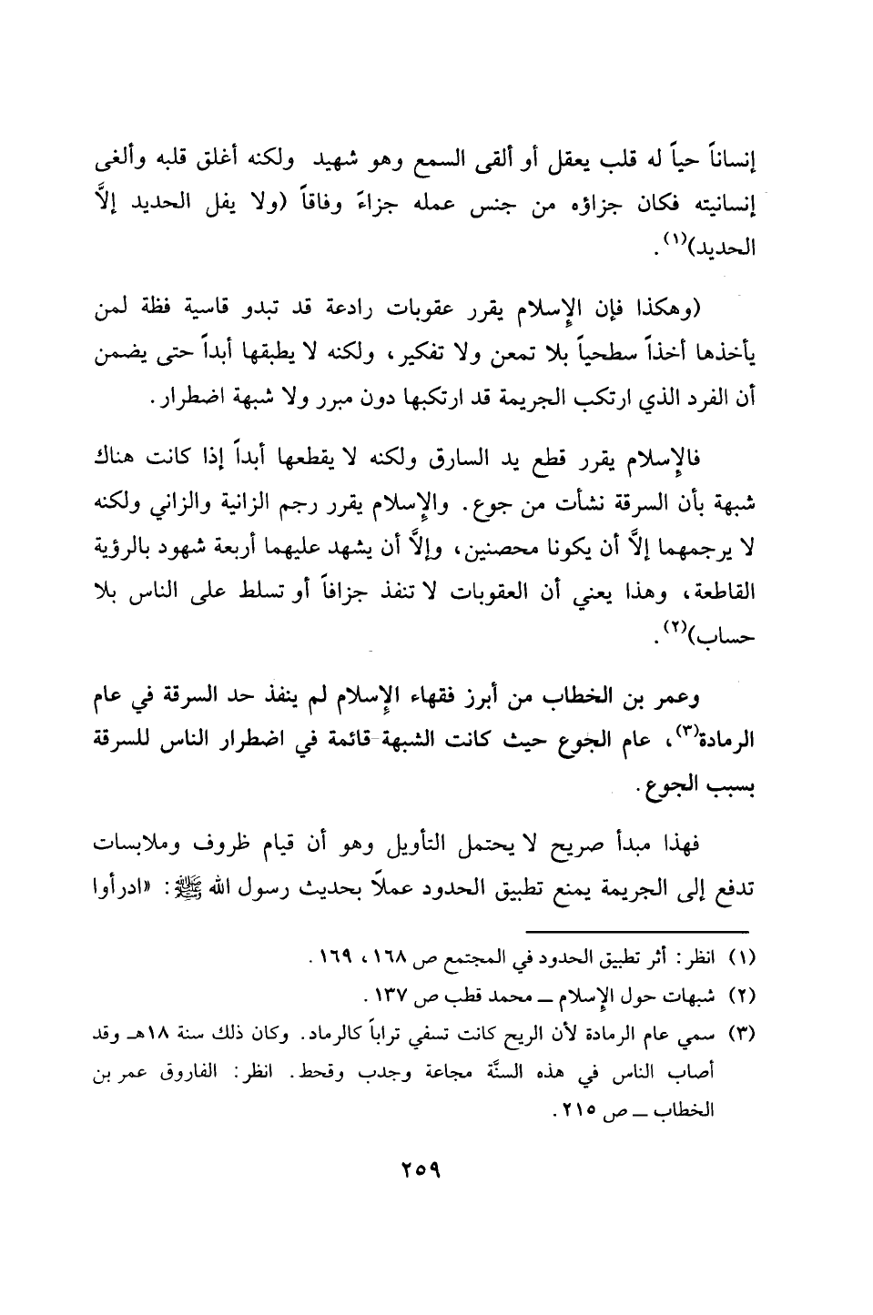 فالإسلام يقرر قطع يد السارق ولكنه لا يقطعها أبدًا إذا كانت هناك شبهة بأن السرقة نشأت من جوع. والإسلام يقرر رجم الزانية والزاني ولكنه لا يرجمهما إلَّا أن يكونا محصنين، وإلَّا أن يشهد عليهما أربعة شهود بالرؤية القاطعة، وهذا يعني أن العقوبات لا تنفذ جزافًا أو تسلط على الناس بلا حساب) (¬2).