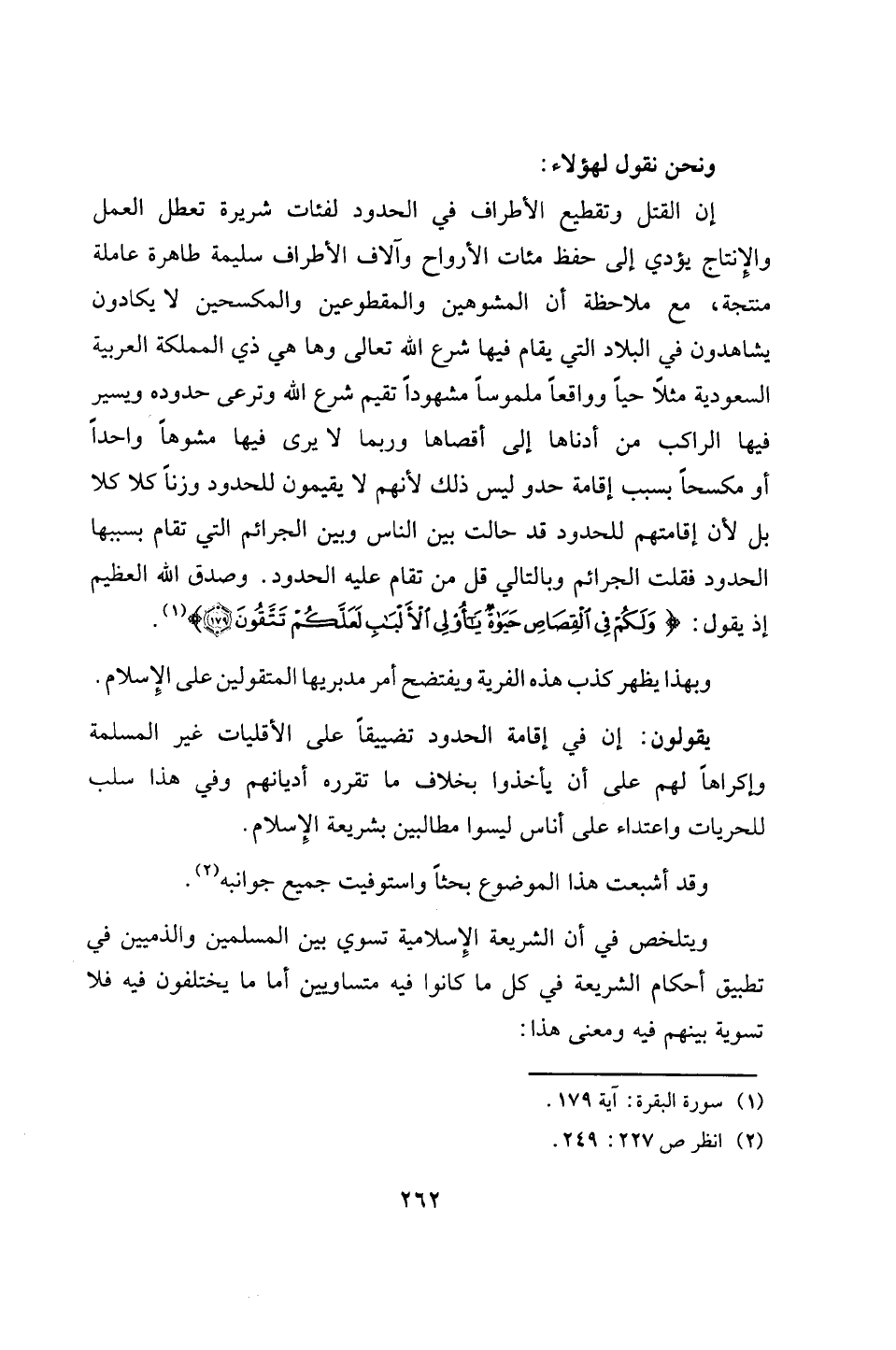 يقولون: إن في إقامة الحدود تضييقًا على الأقليات غير المسلمة وإكراهًا لهم على أن يأخذوا بخلاف ما تقرره أديانهم وفي هذا سلب للحريات واعتداء على أناس ليسوا مطالبين بشريعة الإِسلام.