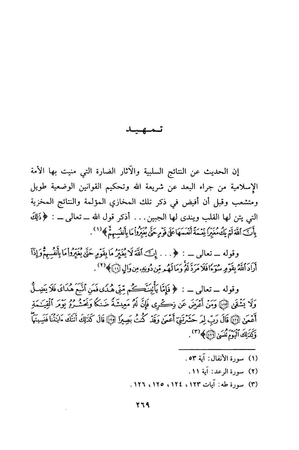 إن الحديث عن النتائج السلبية والآثار الضارة التي منيت بها الأمة الإِسلامية من جراء البعد عن شريعة الله وتحكيم القوانين الوضعية طويل ومتشعب وقبل أن أفيض في ذكر تلك المخازي المؤلمة والنتائج المخزية التي يئن لها القلب ويندى لها الجبين ... أذكر قول الله -تعالى-: {ذَلِكَ بِأَنَّ اللَّهَ لَمْ يَكُ مُغَيِّرًا نِعْمَةً أَنْعَمَهَا عَلَى قَوْمٍ حَتَّى يُغَيِّرُوا مَا بِأَنْفُسِهِمْ} (¬1).