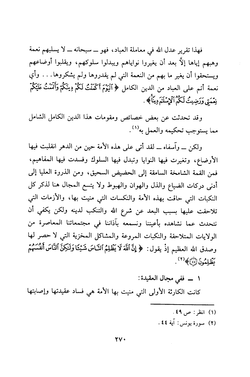 ولكن -وآسفاه- لقد أتى على هذه الأمة حين من الدهر انقلبت فيها الأوضاع، وتغيرت فيها النوايا وتبدل فيها السلوك وفسدت فيها المفاهيم، فمن القمة الشامخة السامقة إلى الحضيض السحيق، ومن الذروة العليا إلى أدنى دركات الضياع والذل والهوان والهبوط ولا يتسع المجال هنا لذكر كل النكبات التي حاقت بهذه الأمة والنكسات التي منيت بها، والأزمات التي تلاحقت عليها بسبب البعد عن شرع الله والتنكب لدينه ولكن يكفي أن نتحدث عما نشاهده بأعيننا ونسمعه بآذاننا في مجتمعاتنا المعاصرة من الولايات المتلاحقة والنكبات المروعة والمشاكل المخزية التي لا حصر لها وصدق الله العظيم إذْ يقول: {إِنَّ اللَّهَ لَا يَظْلِمُ النَّاسَ شَيْئًا وَلَكِنَّ النَّاسَ أَنْفُسَهُمْ يَظْلِمُونَ (44)} (¬2).