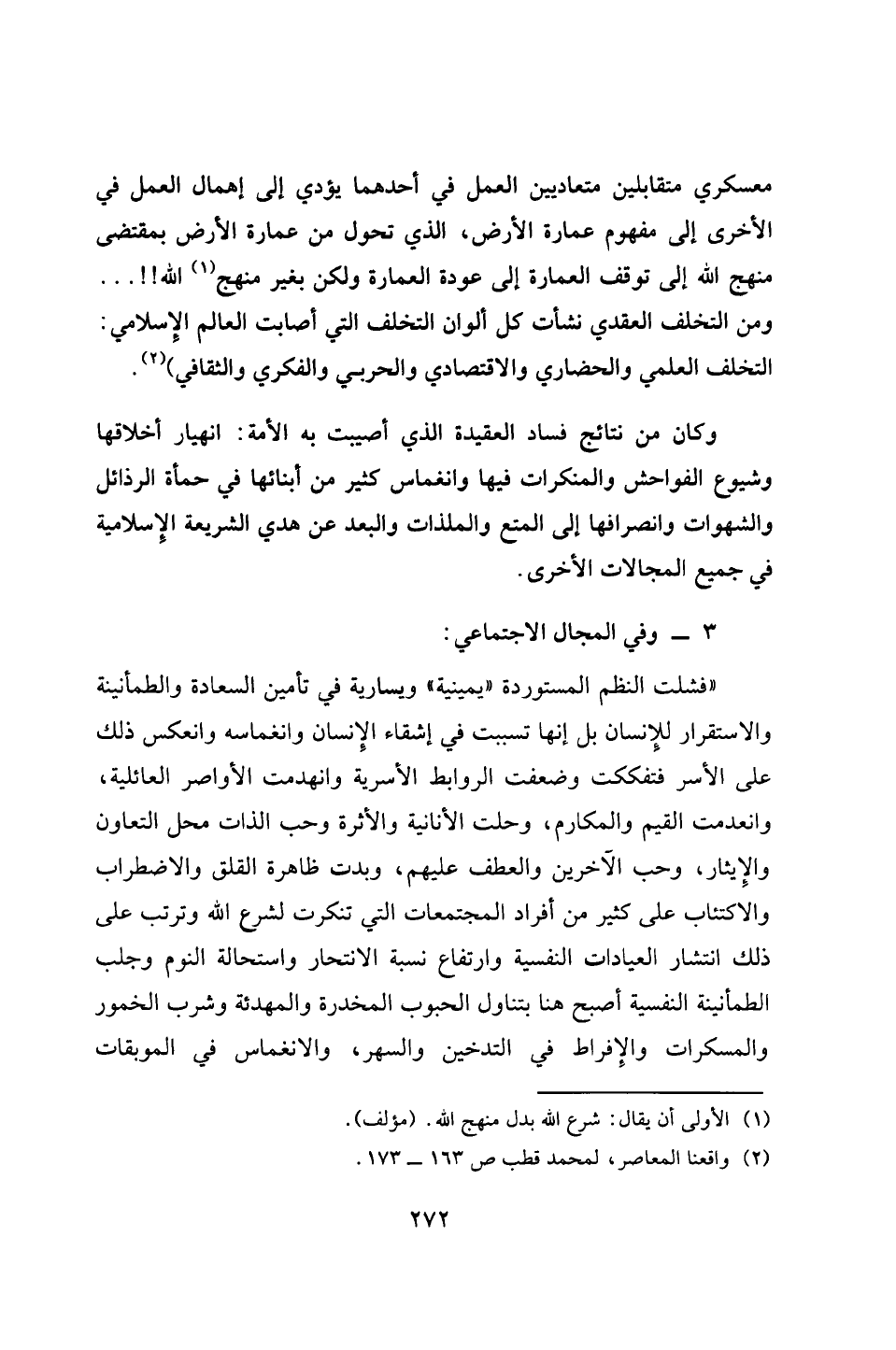 معسكري متقابلين متعاديين العمل في أحدهما يؤدي إلى إهمال العمل في الأخرى إلى مفهوم عمارة الأرض، الذي تحول من عمارة الأرض بمقتضى منهج الله إلى توقف العمارة إلى عودة العمارة ولكن بغير منهج (¬1) الله!! ...