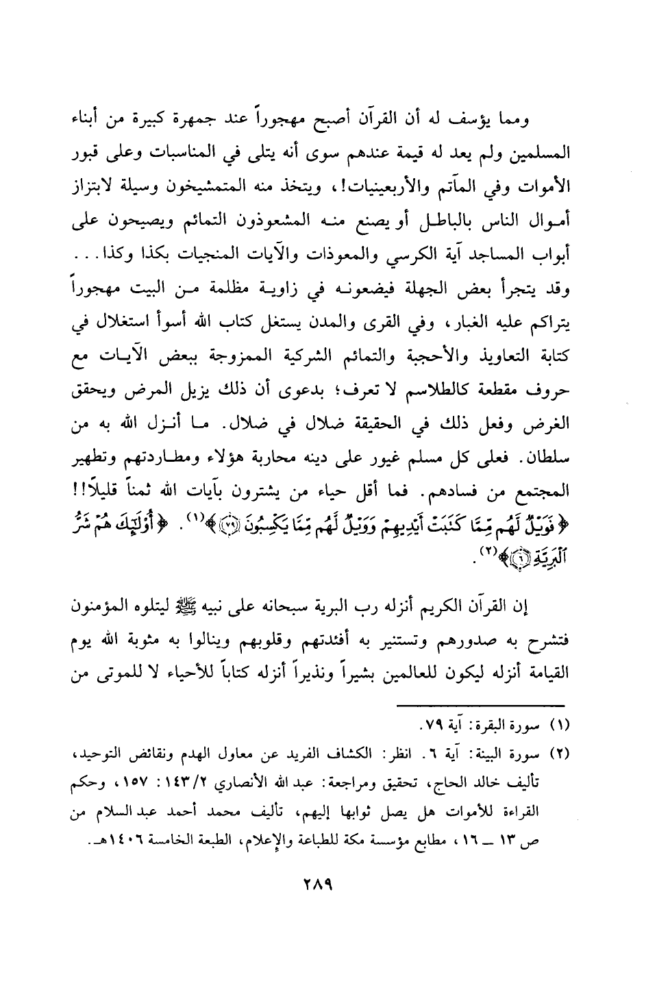 (¬2) سورة البينة: آية 6. انظر: الكشاف الفريد عن معاول الهدم ونقائض التوحيد، تأليف خالد الحاج، تحقيق ومراجعة: عبد الله الأنصاري 2/ 143: 157، وحكم القراءة للأموات هل يصل ثوابها إليهم، تأليف محمد أحمد عبد السلام من ص 13 - 16، مطابع مؤسسة مكة للطباعة والإعلام، الطبعة الخامسة 1406 هـ.