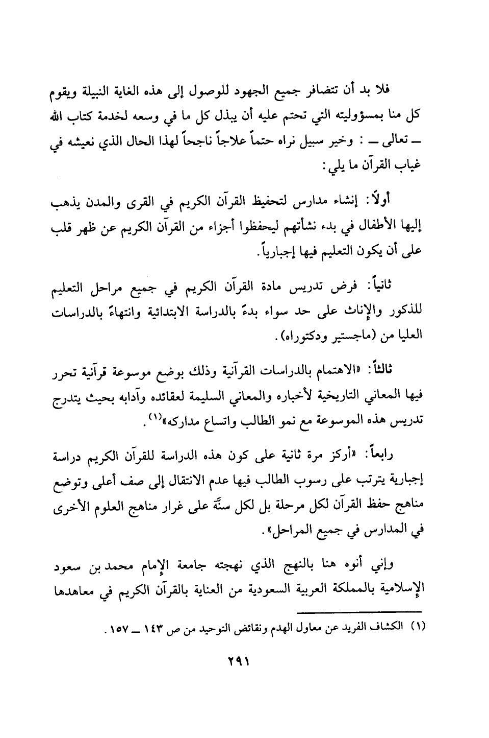 رابعًا: "أركز مرة ثانية على كون هذه الدراسة للقرآن الكريم دراسة إجبارية يترتب على رسوب الطالب فيها عدم الإنتقال إلى صف أعلى وتوضع مناهج حفظ القرآن لكل مرحلة بل لكل سنَّة على غرار مناهج العلوم الأخرى في المدارس في جميع المراحل".