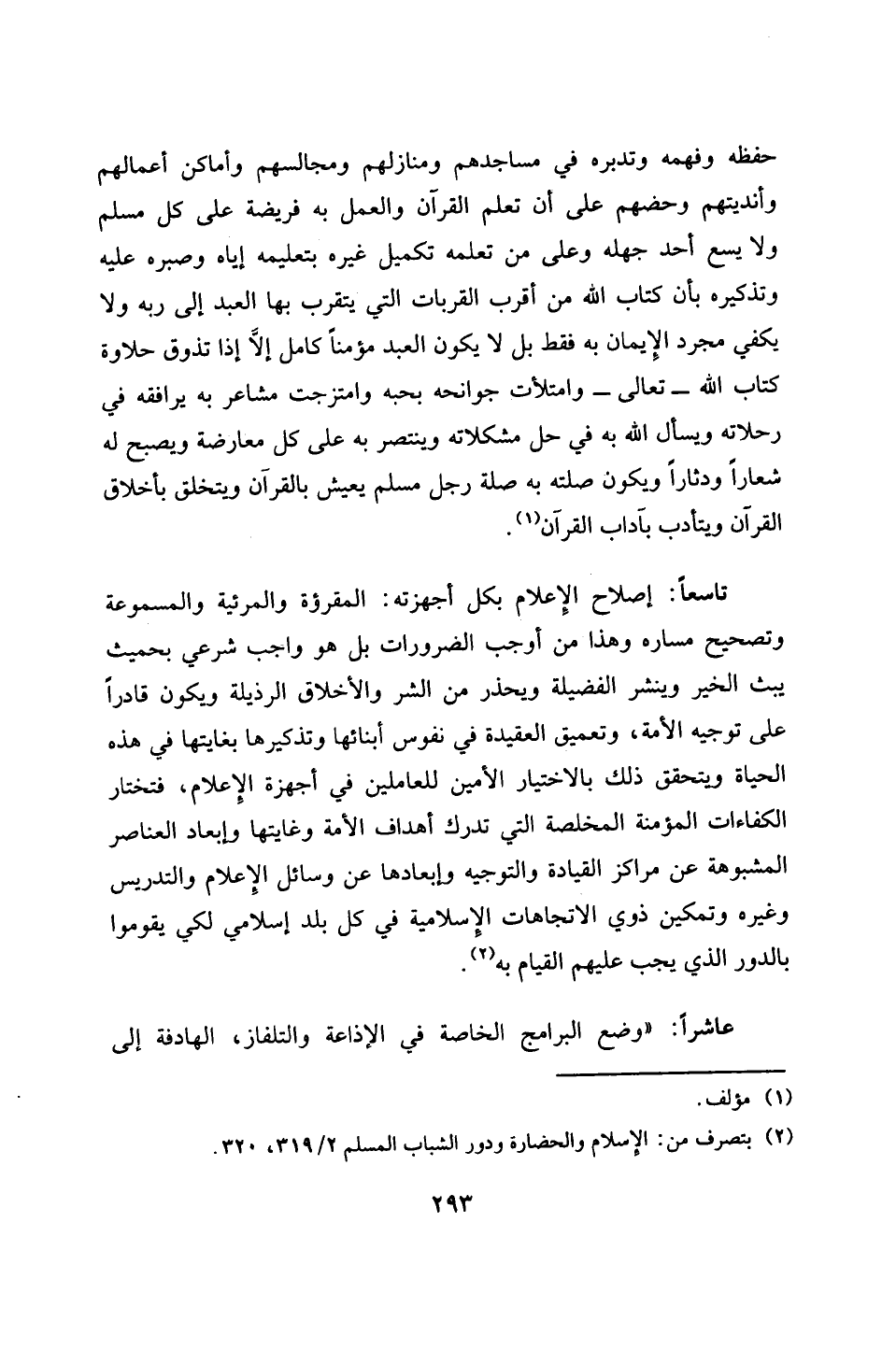 تاسعًا: إصلاح الإعلام بكل أجهزته: المقرؤة والمرئية والمسموعة وتصحيح مساره وهذا من أوجب الضرورات بل هو واجب شرعي بحيث يبث الخير وينشر الفضيلة ويحذر من الشر والأخلاق الرذيلة ويكون قادرًا على توجيه الأمة، وتعميق العقيدة في نفوس أبنائها وتذكيرها بغايتها في هذه الحياة ويتحقق ذلك بالاختيار الأمين للعاملين في أجهزة الإعلام، فتختار الكفاءات المؤمنة المخلصة التي تدرك أهداف الأمة وغايتها وإبعاد العناصر المشبوهة عن مراكز القيادة والتوجيه وإبعادها عن وسائل الإعلام والتدريس وغيره وتمكين ذوي الإتجاهات الإِسلامية في كل بلد إسلامي لكي يقوموا بالدور الذي يجب عليهم القيام به (¬2).