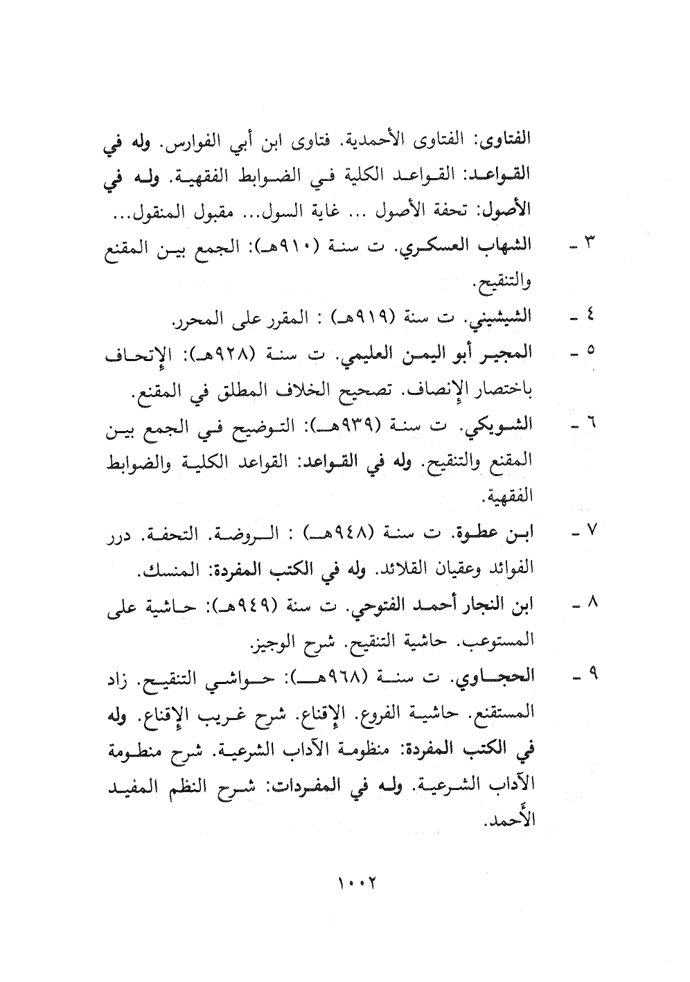 ٩- الحجاوي ت سنة (٩٦٨ هـ) : حواشي التنقيح. زاد المستقنع. حاشية الفروع. الإقناع. شرح غريب الإقناع. وله في الكتب المفردة: منظومة الآداب الشرعية. شرح منظومة الآداب الشرعية. وله في المفردات: شرح النظم المفيد الأحمد.