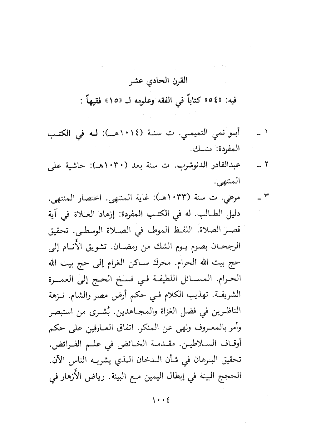 ٣- مرعي ت سنة (١٠٣٣ هـ) : غاية المنتهى. اختصار المنتهى. دليل الطالب. له في الكتب المفردة: إزهاد الغلاة في آية قصر الصلاة. اللفظ الموطا في الصلاة الوسطى. تحقيق الرجحان بصوم يوم الشك من رمضان. تشويق الأنام إلى حج بيت الله الحرام. محرك ساكن الغرام إلى حج بيت الله الحرام. المسائل اللطيفة في فسخ الحج إلى العمرة الشريفة. تهذيب الكلام في حكم أرض مصر والشام. نزهة الناظرين في فضل الغزاة والمجاهدين. بشرى من استبصر وأمر بالمعروف ونهى عن المنكر اتفاق العارفين على حكم أوقاف السلاطين. مقدمة الخائض في علم الفرائض. تحقيق البرهان في شأن الدخان الذي يشربه الناس الآن. الحجج البينة في إبطال اليمين مع البينة. رياض الأزهار في