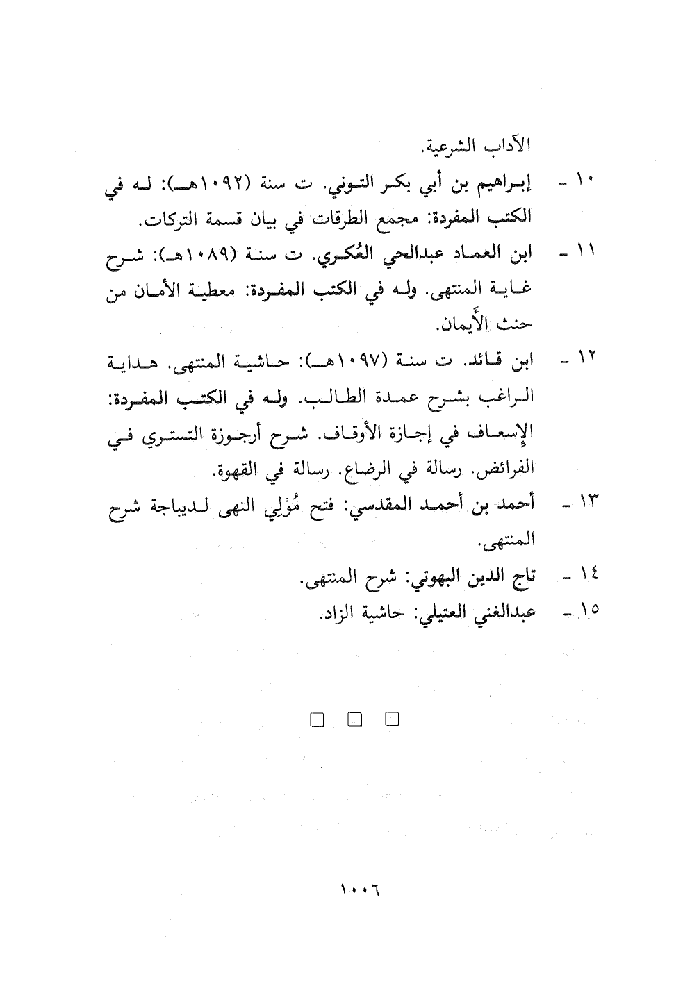 ١٢- ابن قائد ت سنة (١٠٩٧ هـ) : حاشية المنتهى. هداية الراغب بشرح عمدة الطالب. وله في الكتب المفردة: الإسعاف في إجازة الأوقاف. شرح أرجوزة التستري في الفرائض. رسالة في الرضاع. رسالة في القهوة.