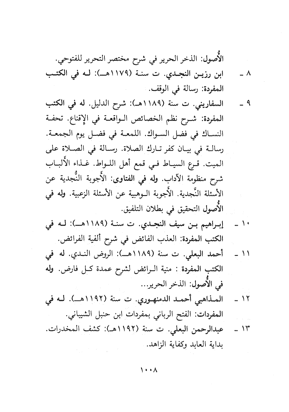 ٩- السفاريني ت سنة (١١٨٩ هـ) : شرح الدليل. له في الكتب المفردة: شرح نظم الخصائص الواقعة في الإقناع. تحفة النساك في فضل السواك. اللمعة في فضل يوم الجمعة. رسالة في بيان كفر تارك الصلاة. رسالة في الصلاة على الميت. قرع السياط في قمع أهل اللواط. غذاء الألباب شرح منظومة الآداب. وله في الفتاوى: الأجوبة النُّجدية عن الأسئلة النَّجدية. الأجوبة الوهبية عن الأسئلة الزعبية. وله في الأصول التحقيق في بطلان التلفيق.