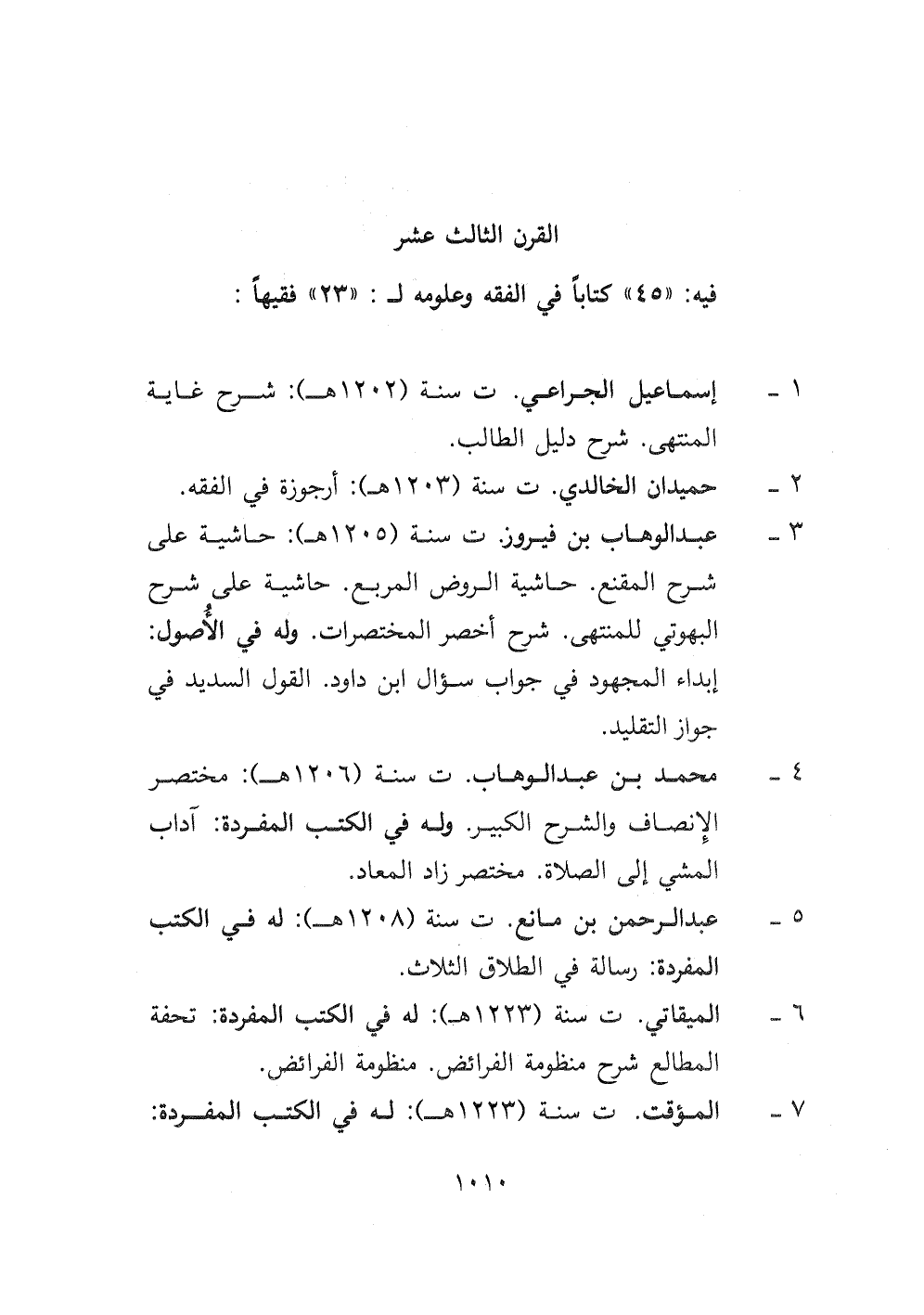 ٤- محمد بن عبد الوهاب ت سنة (١٢٠٦ هـ) : مختصر الإنصاف والشرح الكبير وله في الكتب المفردة: آداب المشي إلى الصلاة. مختصر زاد المعاد.