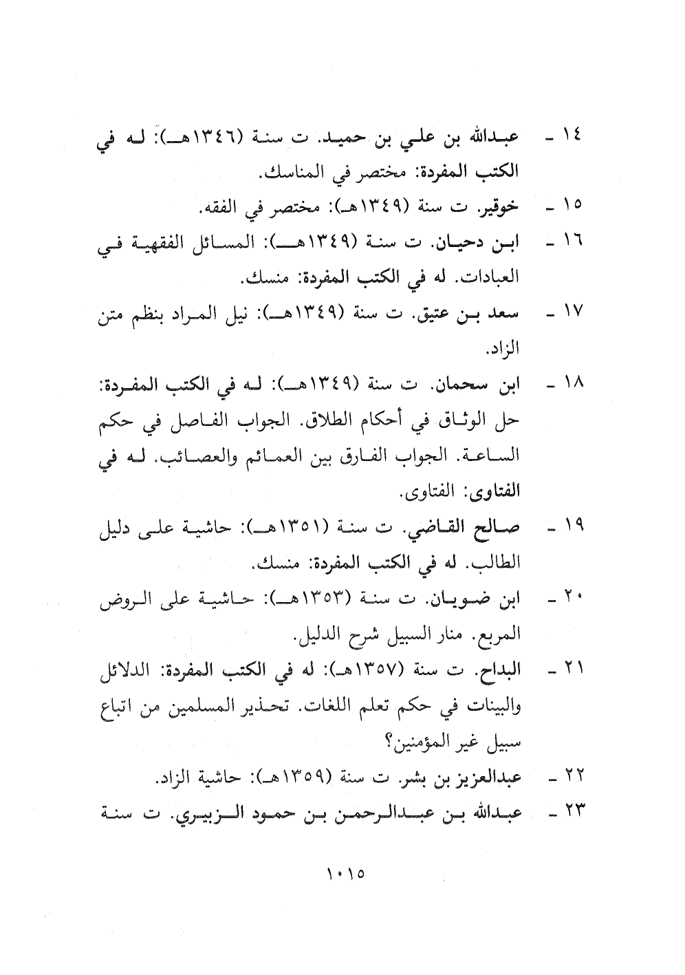 ١٨- ابن سحمان ت سنة (١٣٤٩ هـ) : له في الكتب المفردة: حل الوثاق في أحكام الطلاق. الجواب الفاصل في حكم الساعة. الجواب الفارق بين العمائم والعصائب. له في الفتاوى: الفتاوى.