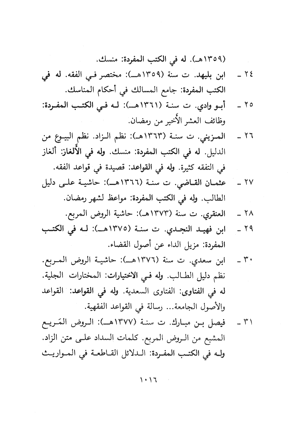 ٢٦- المزيني ت سنة (١٣٦٣ هـ) : نظم الزاد. نظم البيوع من الدليل. له في الكتب المفردة: منسك. وله في الألغاز ألغاز في التفقه كثيرة. وله في القواعد: قصيدة في قواعد الفقه.