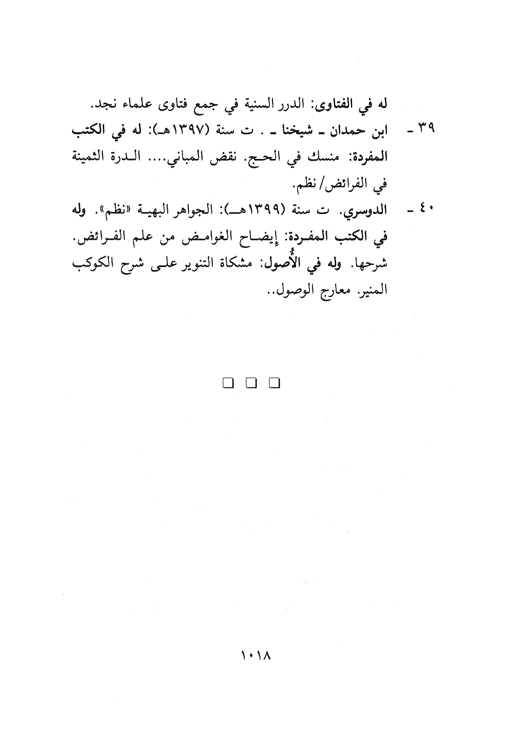 ٣٩- ابن حمدان - شيخنا - ت سنة (١٣٩٧ هـ) : له في الكتب المفردة: منسك في الحج. نقض المباني ... الدرة الثمينة في الفرائض/ نظم.