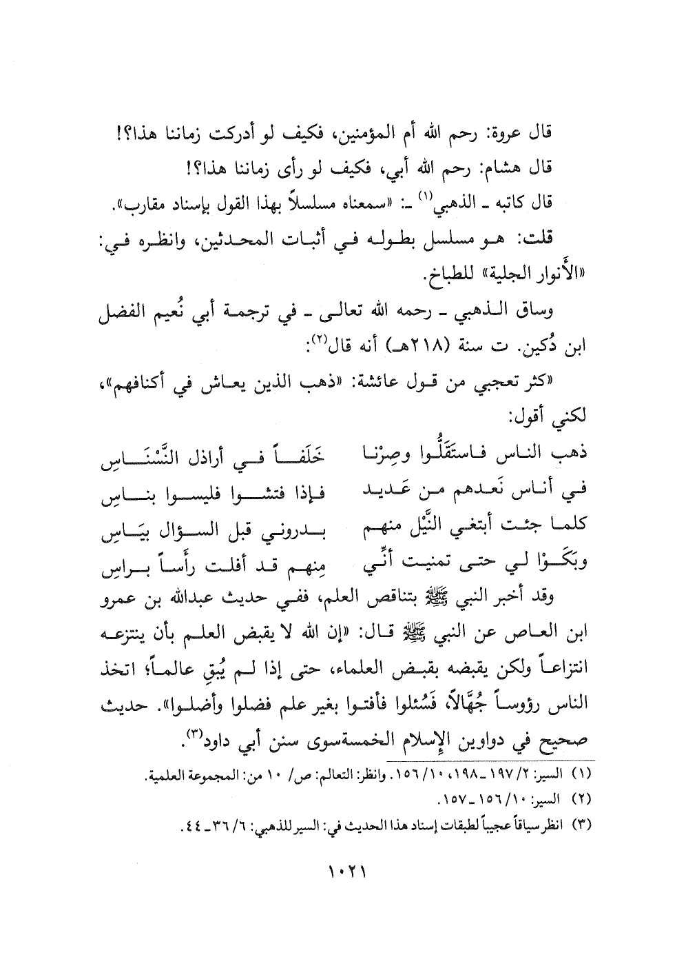 وقد أخبر النبي صلى الله عليه وسلم بتناقص العلم، ففي حديث عبد الله بن عمرو ابن العاص عن النبي صلى الله عليه وسلم قال: " إن الله لا يقبض العلم بأن ينتزعه انتزاعاً ولكن يقبضه بقبض العلماء، حتى إذا لم يُبقِ عالماً؛ اتخذ الناس رؤوساً جُهَّالًا فسئلوا فأفتوا بغير علم فضلوا وأضلوا ". حديث صحيح في دواوين الإسلام الخمسة سوى سنن أبي داود (٣) .