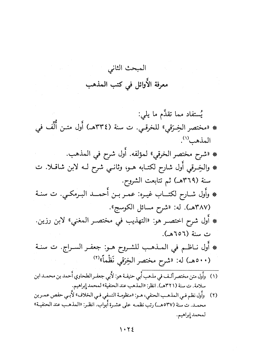 (١) وأول متن مختصر ألف في مذهب أبي حنيفة هو لأبي جعفر الطحاوي أحمد بن محمد ابن سلامة ت سنة (٣٢١ هـ) . انظر (المذهب عند الحنفية) لمحمد إبراهيم.