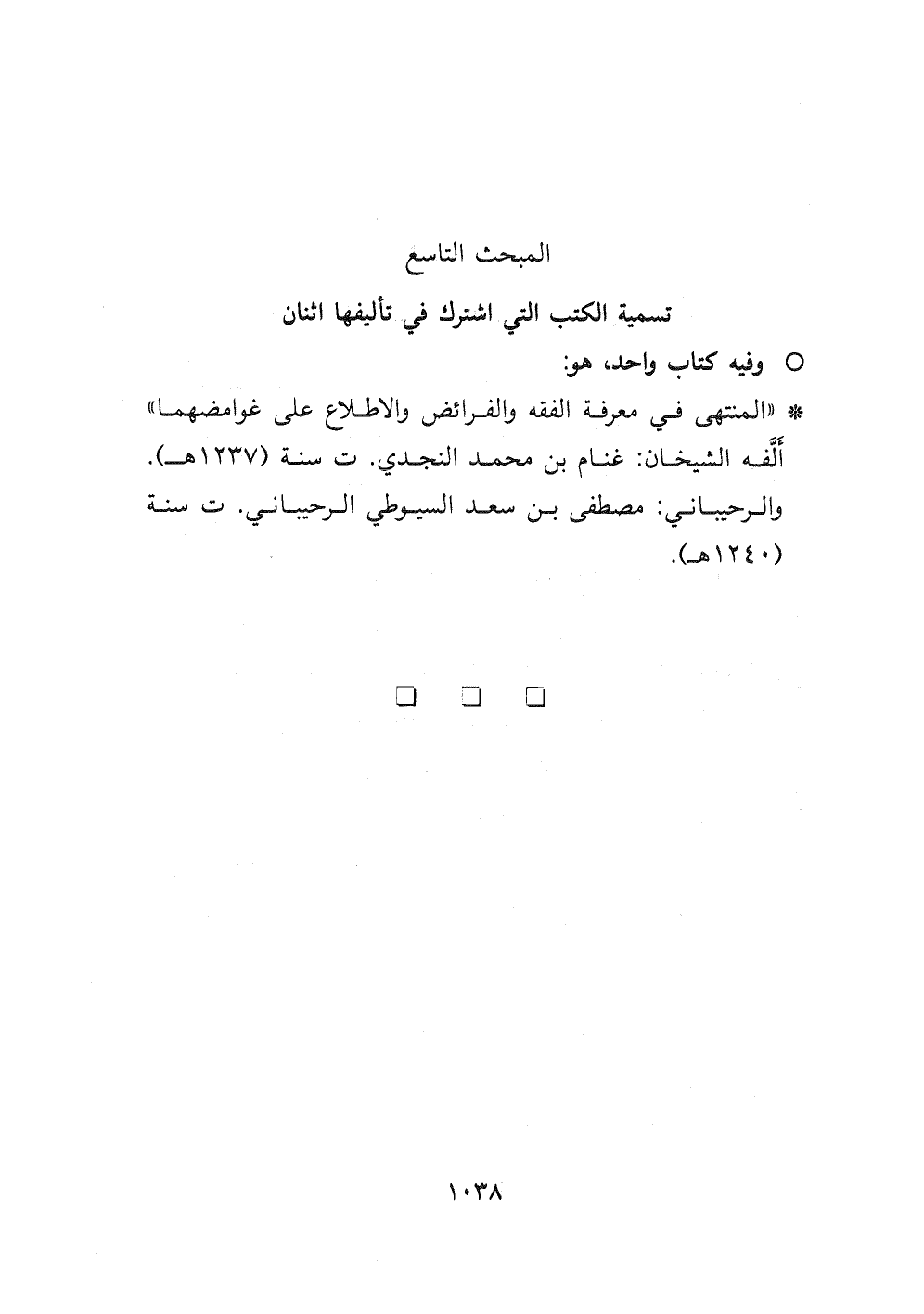 - " المنتهى في معرفة الفقه والفرائض والاطلاع على غوامضهما " ألفه الشيخان: غنام بن محمد النجدي ت سنة (١٢٣٧ هـ) . والرحيباني: مصطفى بن سعد السيوطي الرحيباني ت سنة (١٢٤٠ هـ) .