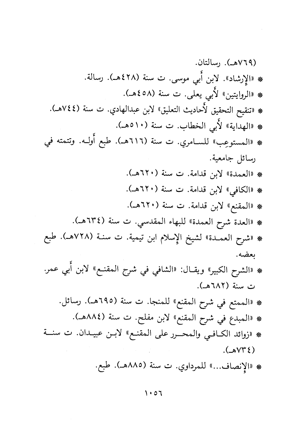 - " المستوعب " للسامري ت سنة (٦١٦ هـ) . طبع أوله. وتتمته في رسائل جامعية.