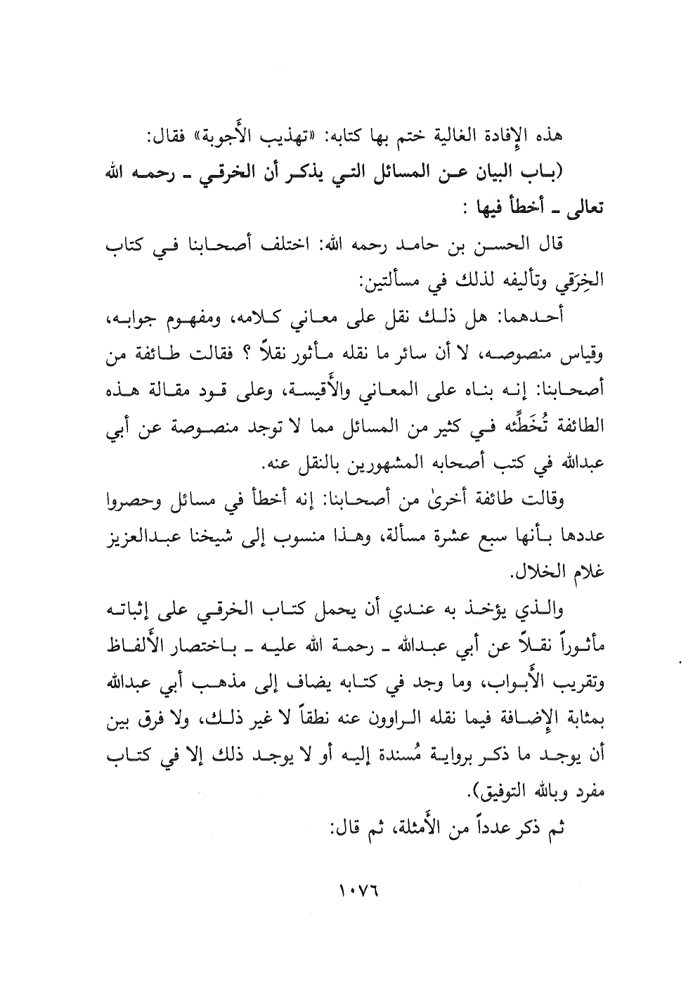 هذه الإفادة الغالية ختم بها كتابه: " تهذيب الأجوبة " فقال: (باب البيان عن المسائل التي يذكر أن الخرقي- رحمه الله تعالى- أخطأ فيها: