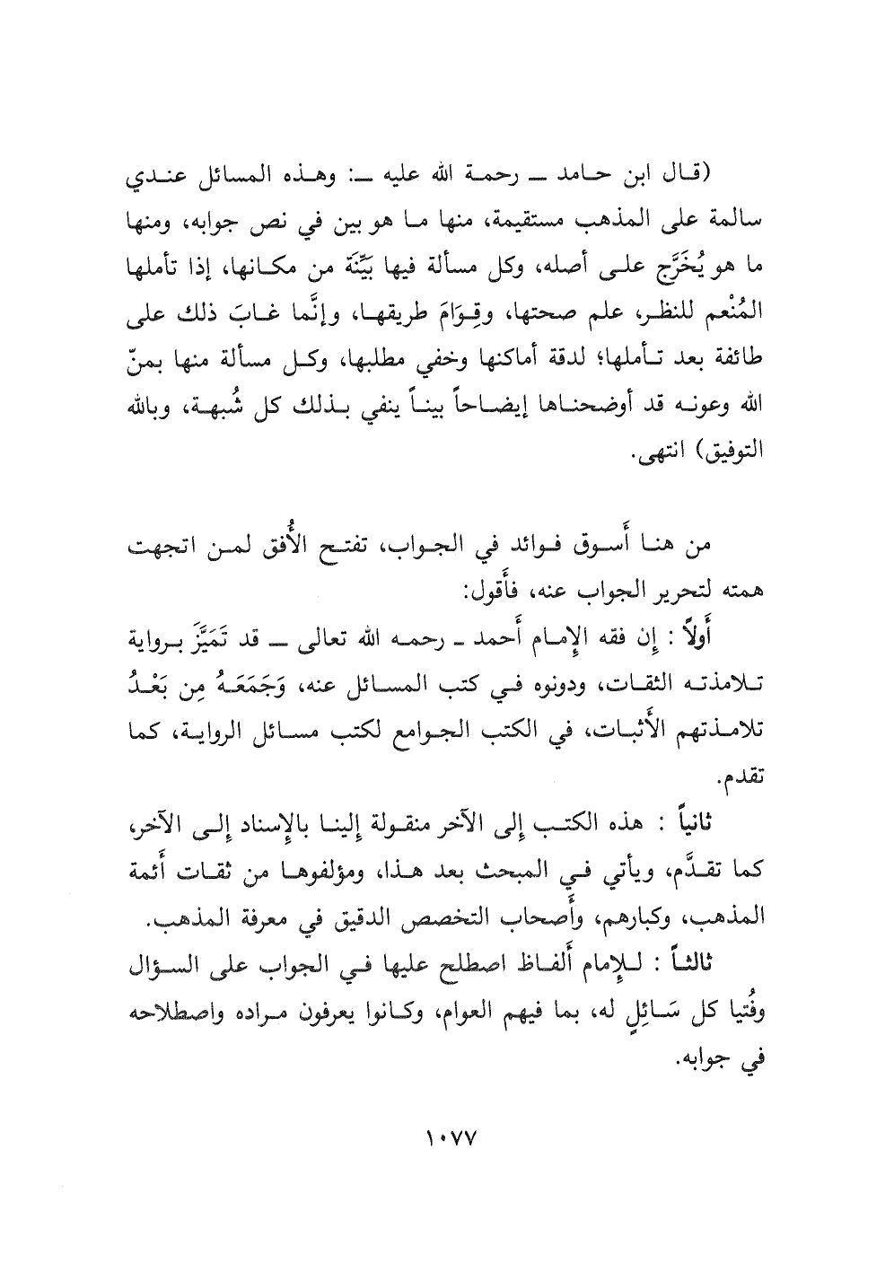 (قال ابن حامد - رحمة الله عليه -: وهذه المسائل عندي سالمة على المذهب مستقيمة، منها ما هو بين في نص جوابه، ومنها ما هو يُخَرَّج على أصله، وكل مسألة فيها بَيِّنَة من مكانها، إذا تأملها المنعم للنظر، علم صحتها، وقوام طريقها، وإنما غاب ذلك على طائفة بعد تأملها؛ لدقة أماكنها وخفي مطلبها، وكل مسألة منها بمن الله وعونه قد أوضحناها إيضاحاً بيناً ينفي بذلك كل شبهة، وبالله التوفيق) انتهى.