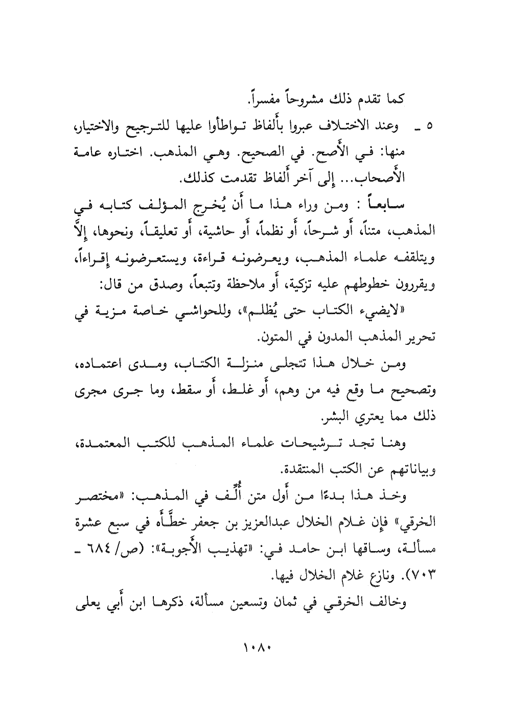 وخذ هذا بدءًا من أول متن ألِّف في المذهب: " مختصر الخرقي " فإن غلام الخلال عبد العزيز بن جعفر خطَّأه في سبع عشرة مسألة، وساقها ابن حامد في: " تهذيب الأجوبة: (ص/ ٦٨٤- ٧٠٣) . ونازع غلام الخلال فيها.