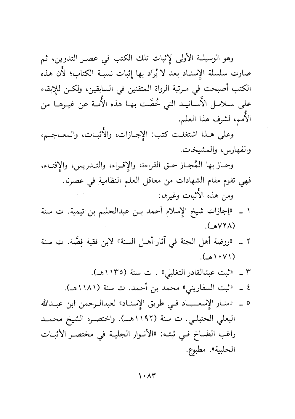 وهو الوسيلة الأولى لإثبات تلك الكتب في عصر التدوين، ثم صارت سلسلة الإسناد بعد لا يراد بها إثبات نسبة الكتاب؛ لأن هذه الكتب أصبحت في مرتبة الرواة المتقنين في السابقين، ولكن للإبقاء على سلاسل الأسانيد التي خُصَّت بها هذه الأمة عن غيرها من الأمم، لشرف هذا العلم.
