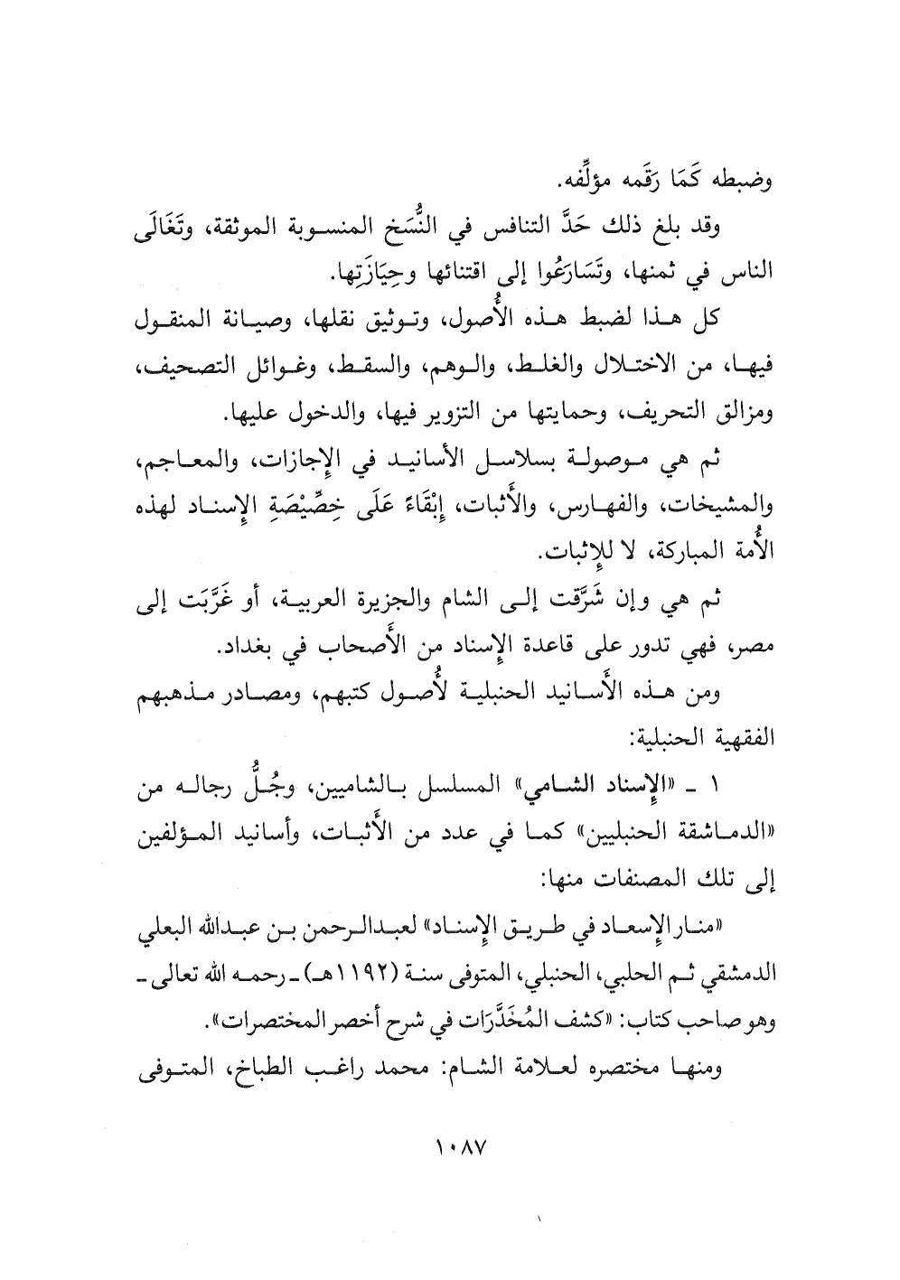 ١- " الإسناد الشامي " المسلسل بالشاميين، وجل رجاله من " الدماشقة الحنبليين " كما في عدد من الأثبات، وأسانيد المؤلفين إلى تلك المصنفات منها: