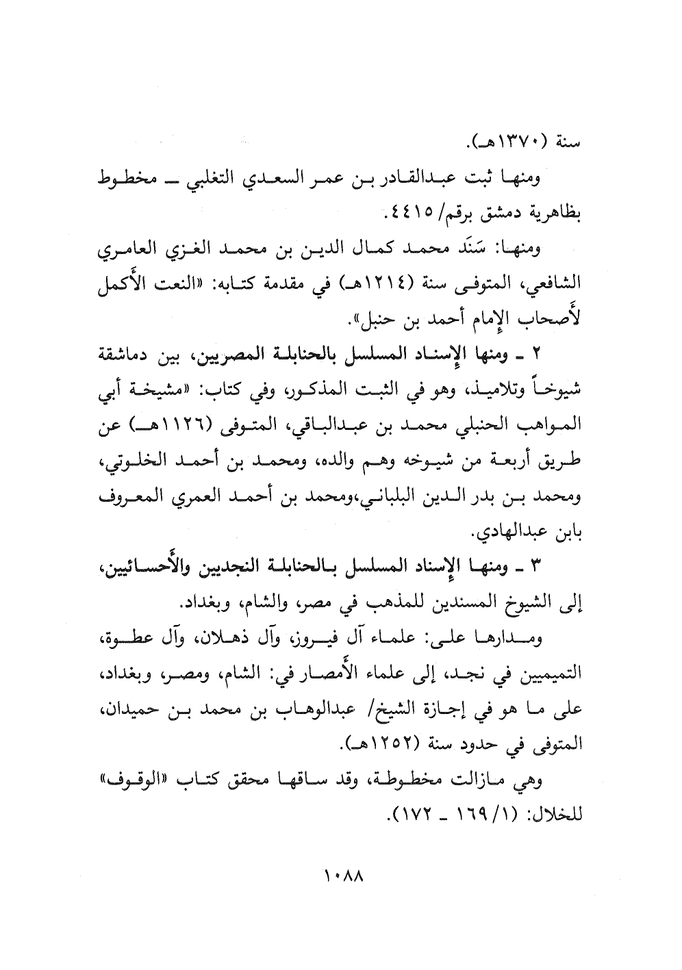 ٣- ومنها الإسناد المسلسل بالحنابلة النجديين والأحسائيين، إلى الشيوخ المسندين للمذهب في مصر والشام، وبغداد.