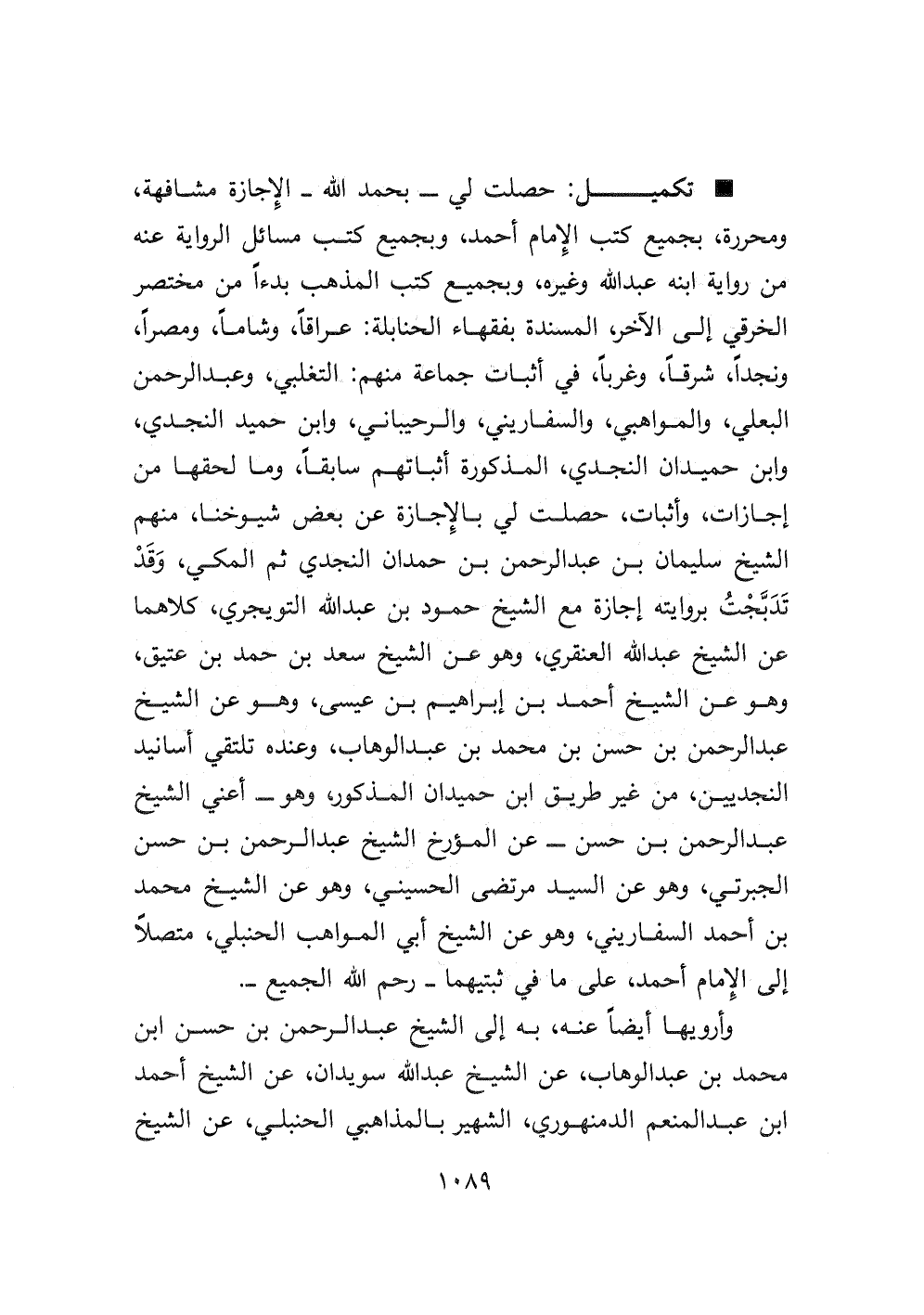 * تكميل: حصلت لي - بحمد الله - الإجازة مشافهة، ومحررة، بجميع كتب الإمام أحمد، وبجميع كتب مسائل الرواية عنه من رواية ابنه عبد الله وغيره، وبجميع كتب المذهب بدءاً من مختصر الخرقي إلى الآخر، المسندة بفقهاء الحنابلة: عراقاً، وشاماً، ومصراً، ونجداً، شرقاً، وغرباً، في أثبات جماعة منهم: التغلبي، وعبد الرحمن البعلي، والمواهبي، والسفاريني، والرحيباني، وابن حميد النجدي، وابن حميدان النجدي، المذكورة أثباتهم سابقاً، وما لحقها من إجازات، وأثبات، حصلت لي بالإجازة عن بعض شيوخنا، منهم الشيخ سليمان بن عبد الرحمن بن حمدان النجدي ثم المكي، وقد تَدَبَّجْتُ بروايته إجازة مع الشيخ حمود بن عبد الله التويجري، كلاهما عن الشيخ عبد الله العنقري، وهو عن الشيخ سعد بن حمد بن عتيق، وهو عن الشيخ أحمد بن إبراهيم بن عيسى، وهو عن الشيخ عبد الرحمن بن حسن بن محمد بن عبد الوهاب، وعنده تلتقي أسانيد النجديين، من غير طريق ابن حميدان المذكور وهو - أعني الشيخ عبد الرحمن بن حسن - عن المؤرخ الشيخ عبد الرحمن بن حسن الجبرتي، وهو عن السيد مرتضى الحسيني، وهو عن الشيخ محمد بن أحمد السفاريني، وهو عن الشيخ أبي المواهب الحنبلي، متصلاً إلى الإمام أحمد، على ما في ثبتيهما - رحم الله الجميع -.