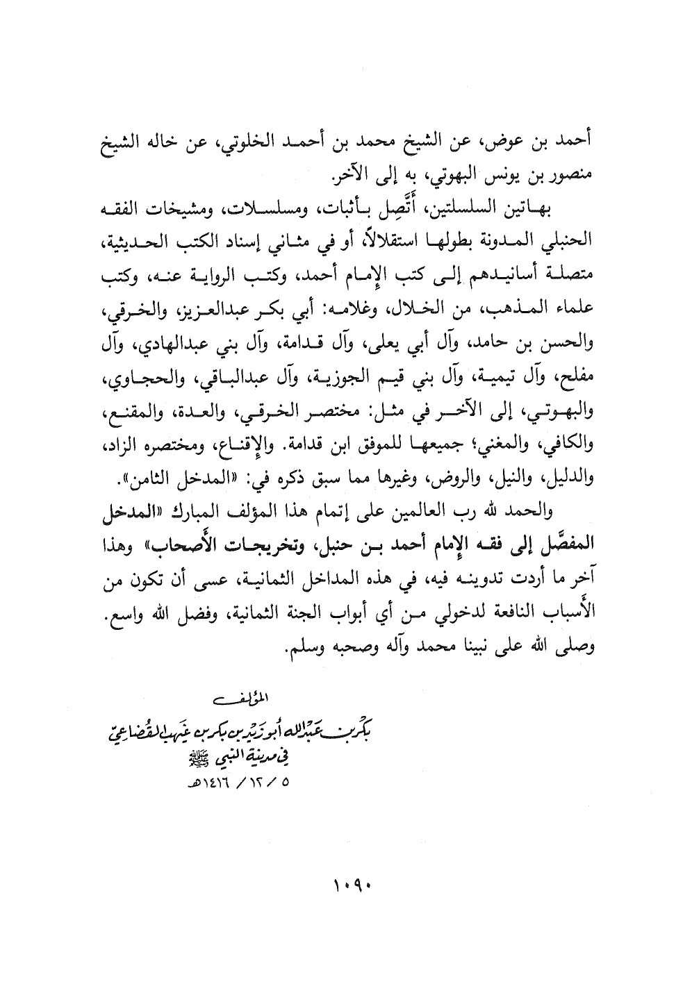 والحمد لله رب العالمين على إتمام هذا المؤلف المبارك " المدخل المفصل إلى فقه الإمام أحمد بن حنبل، وتخريجات الأصحاب " وهذا آخر ما أردت تدوينه فيه، في هذه المداخل الثمانية، عسى أن تكون من الأسباب النافعة لدخولي من أي أبواب الجنة الثمانية، وفضل الله واسع. وصلى الله على نبينا محمد وآله وصحبه وسلم.