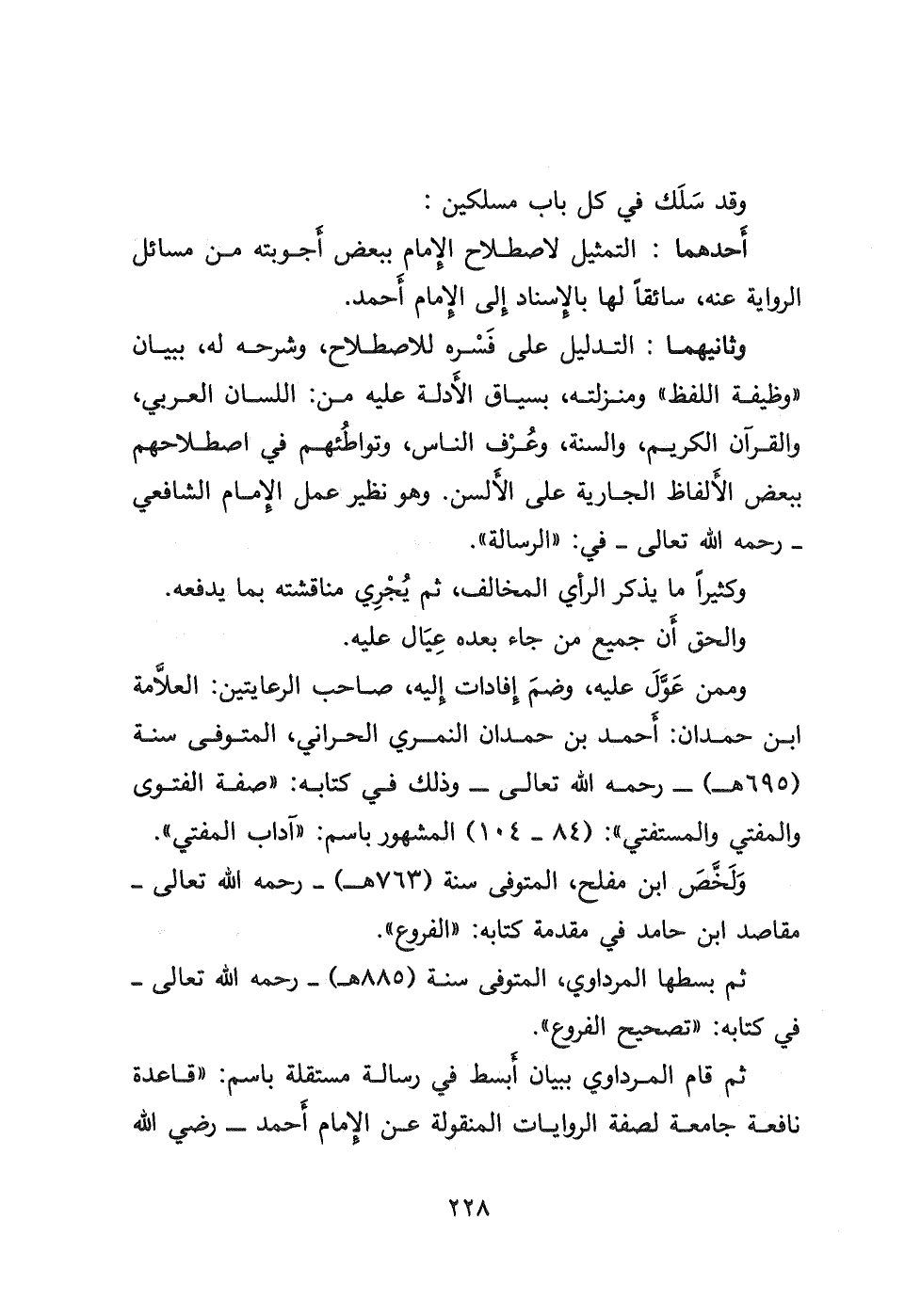 وممن عَوَّلَ عليه، وضمَ إفادات إليه، صاحب الرعايتين: العلاَّمة ابن حمدان: أحمد بن حمدان النمري الحراني، المتوفى سنة (٦٩٥ هـ) - رحمه الله تعالى- وذلك في كتابه: " صفة الفتوى والمفتي والمستفتي " (٨٤- ١٥) المشهور باسم: " آداب المفتي ". وَلَخَّصَ ابن مفلح، المتوفى سنة (٧٦٣ هـ) - رحمه الله تعالى- مقاصد ابن حامد في مقدمة كتابه: " الفروع ".