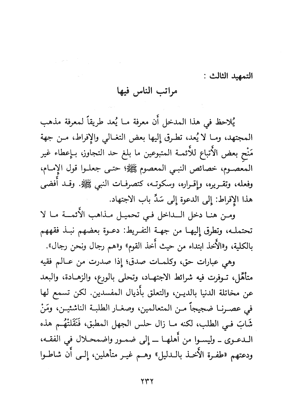 ومن هنا دخل الداخل في تحميل مذاهب الأَئمة ما لا تحتمله، وتطرق إليها من جهة التفريط: دعوة بعضهم نبذ فقههم بالكلية، و" الأخذ ابتداء من حيث أَخذ القوم " و " هم رجال ونحن رجال " وهي عبارات حق، وكلمات صدق؛ إذا صدرت من عالم فقيه متأهل، توفرت فيه شرائط الاجتهاد، وتحلى بالورع، والزهادة، والبعد عن مخاتلة الدنيا بالدين، والتعلق بأذيال المفسدين. لكن تسمع لها في عصرنا ضجيجا من المتعالمين، وصغار الطلبة الناشئين، ومَنْ شَابَ في الطلب، لكنه ما زال حلس الجهل المطبق، فَنَقَلتْهُم هذه الدعوى- وليسوا من أهلها- إلى ضمور واضمحلال في الفقه، ودعتهم " طفرة الأخذ بالدليل " وهم غير متأهلين، إلى أن شاطوا