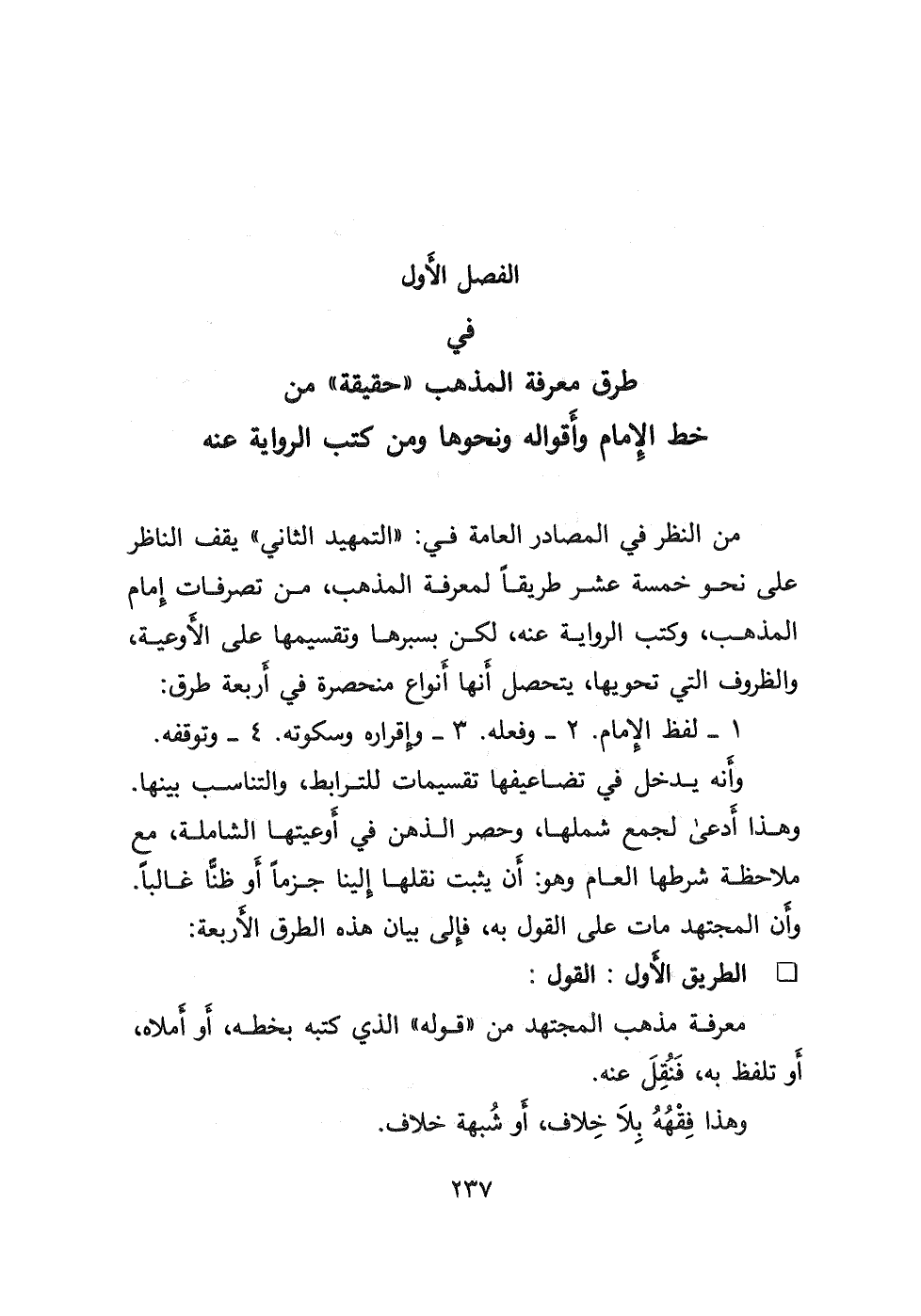 الفصل الأول: في طرق معرفة المذهب " حقيقة " من خط الإمام وأقواله ونحوها ومن كتب الرواية عنه