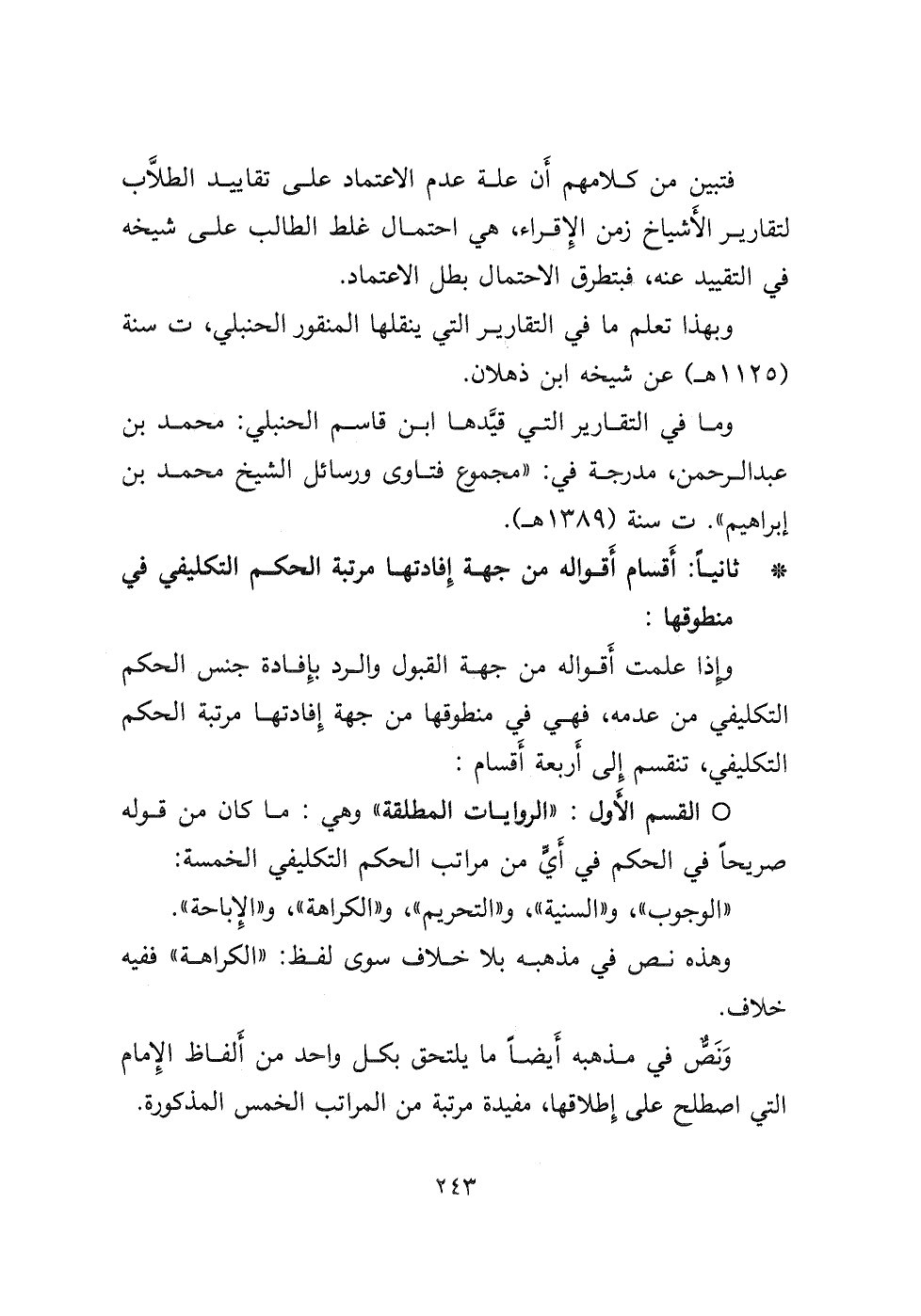 وما في التقارير التي قيَّدها ابن قاسم الحنبلي: محمد بن عبد الرحمن، مدرجة في: " مجموع فتاوى ورسائل الشيخ محمد بن إبراهيم " ت سنة (١٣٨٩ هـ)