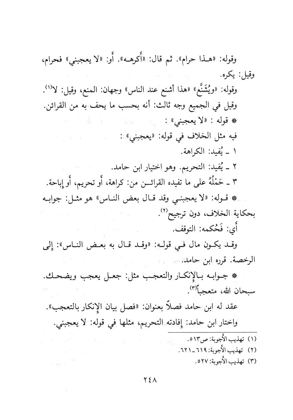 عقد له ابن حامد فصلاً بعنوان. " فصل بيان الِإنكار بالتعجب " واختار ابن حامد: إِفادته التحريم، مثلها في قوله: لا يعجبني