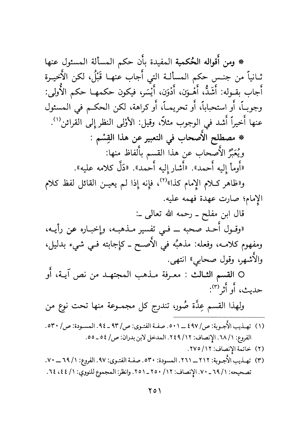 (٣) تهذيب الأجوبة: ٢١٢- ٢٦١ المسودة: ٥٣٠ صفة الفتوى: ٩٧ الفروع: ١/ ٦٩-٧٠ تصحيحه: ١/٦٩-٧٠ الإنصاف: ١٢/٢٥٠- ٢٥١ وانظر المجموع للنووي: ١/ ٤٤، ٦٤.