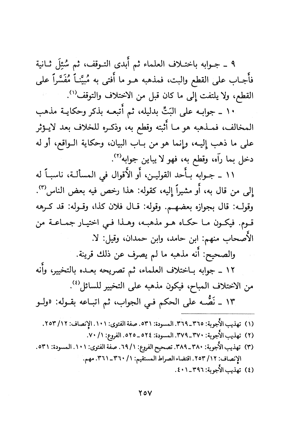 ١٠- جوابه على البَتِّ بدليله، ثم أتبعه بذكر وحكاية مذهب المخالف، فمذهبه هو ما أثبته وقطع به، وذكره للخلاف بعد لا يؤثر على ما ذهب إِليه، وإنما هو من باب البيان، وحكاية الواقع، أو له دخل بما رآه، وقطع به، فهو لا يباين جوابه (٢) .
