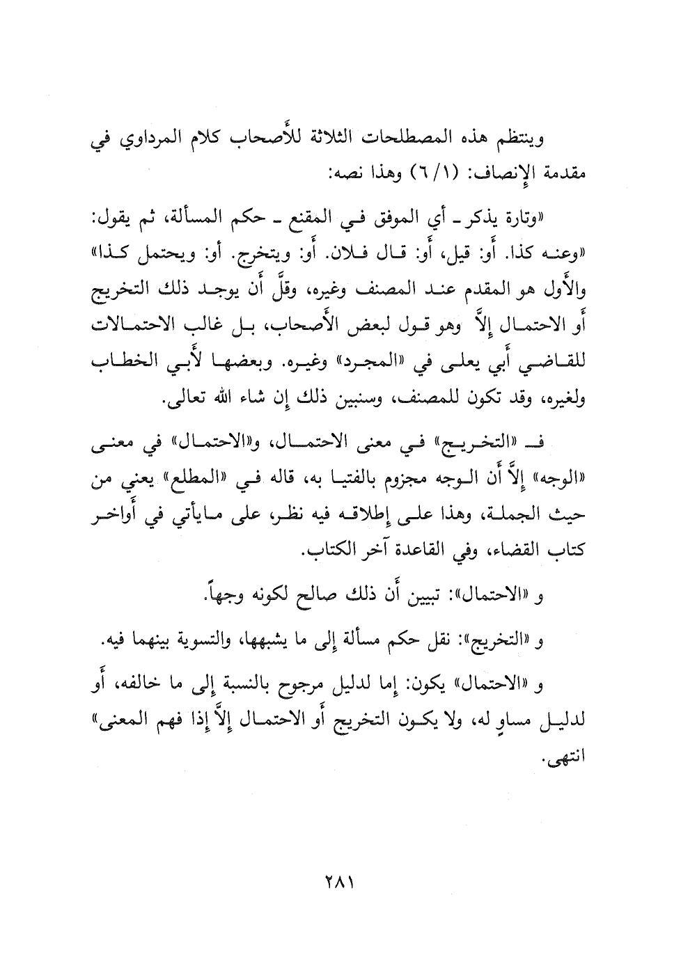 و" الاحتمال " يكون: إِما لدليل مرجوح بالنسبة إلى ما خالفه، أو لدليل مساوٍ له، ولا يكون التخريج أو الاحتمال إلَّا إذا فهم المعنى " انتهى.