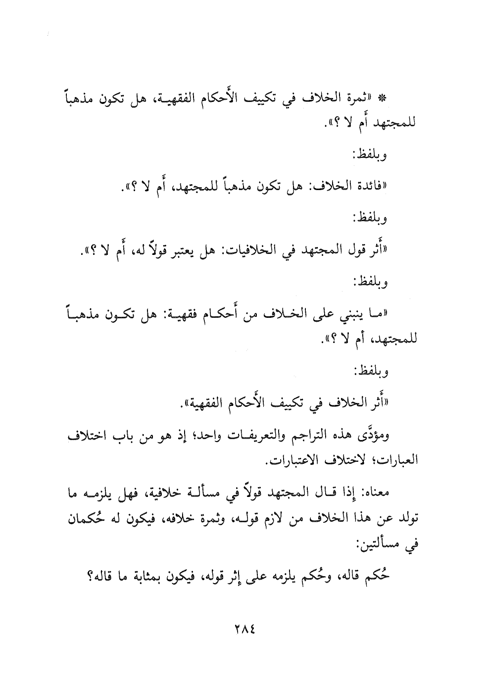 * " ثمرة الخلاف في تكييف الأَحكام الفقهية، هل تكون مذهبًا للمجتهد أَم لا؟ ".