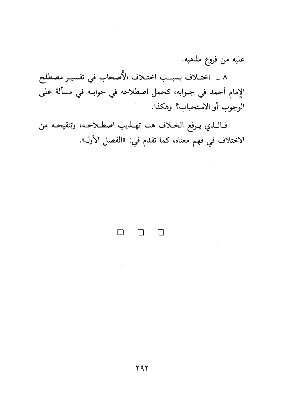 ٨- اختلاف بسبب اختلاف الأصحاب في تفسير مصطلح الإمام أحمد في جوابه، كحمل اصطلاحه في جوابه في مسألة على الوجوب أو الاستحباب؟ وهكذا.