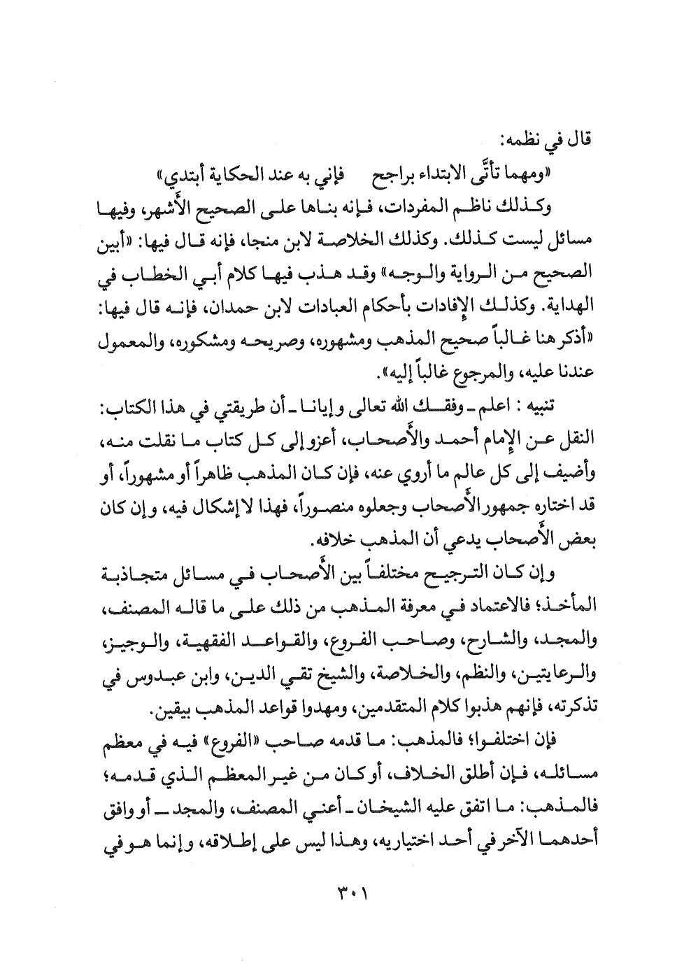 تنبيه: اعلم- وفقك الله تعالى وإيانا- أن طريقتي في هذا الكتاب: النقل عن الإمام أحمد والأصحاب، أعزو إلى كل كتابا ما نقلت منه، وأضيف إلى كل عالم ما أروي عنه، فإن كان المذهب ظاهرا أو مشهورًا، أو قد اختاره جمهور الأصحاب وجعلوه منصورًا، فهذا لا إشكال فيه، وإن كان بعض الأصحاب يدعي أن المذهب خلافه.