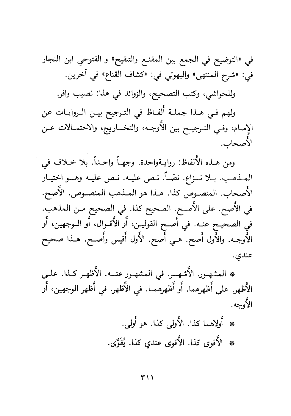 ومن هذه الأَلفاظ: رواية واحدة. وجهًا واحدًا بلا خلاف في المذهب. بلا نزاع. نصًّا. نص عليه. نص عليه وهو اختيار الأصحاب. المنصوص كذا. هذا هو المذهب المنصوص. الأَصح. في الأصح. على اللأصح. الصحيح كذا. في الصحيح من المذهب. في الصحيح عنه. في أَصح القولين، أو الأقوال، أو الوجهين، أو الأَوجه. والأول أَصح. هي أَصح. الأول أَقيس وأَصح. هذا صحيح عندي