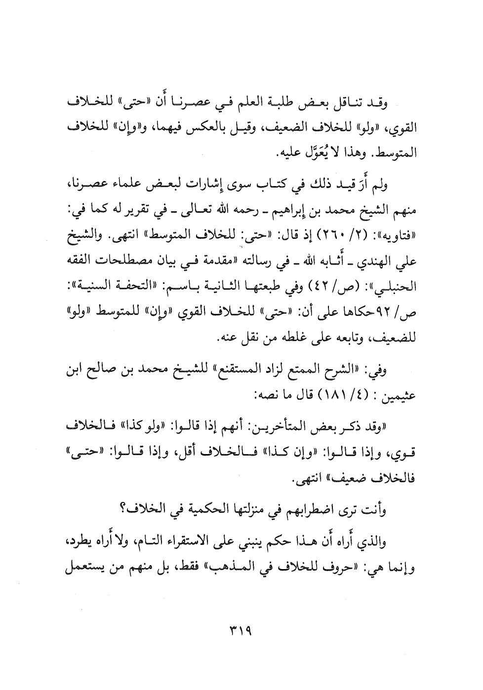 ولم أَرَ قيد ذلك في كتاب سوى إِشارات لبعض علماء عصرنا، منهم الشيخ محمد بن إبراهيم- رحمه الله تعالى- في تقرير له كما في: " فتاويه ": (٢/ ٢٦٠) إذ قال: " حتى: للخلاف المتوسط " انتهى. والشيخ علي الهندي- أَثابه الله- في رسالته " مقدمة في بيان مصطلحات الفقه الحنبلي ": (ص/ ٤٢) وفي طبعتها الثانية باسم: " التحفة السنية ": ص/ ٩٢ حكاها على أن: " حتى " للخلاف القوي " وإن " للمتوسط " ولو " للضعيف، وتابعه على غلطه من نقل عنه.