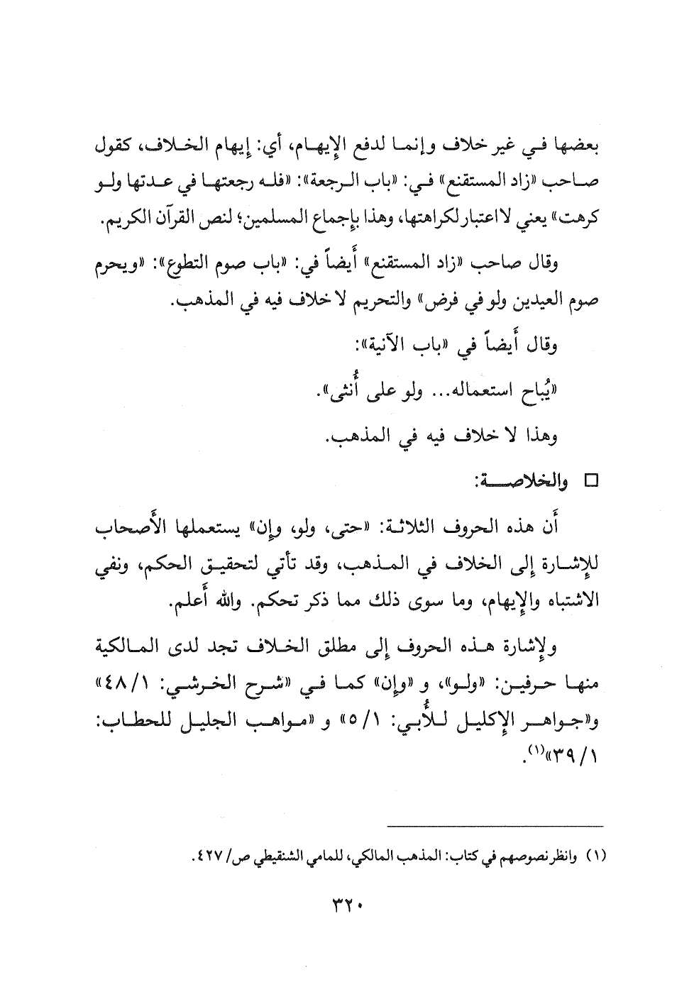 أَن هذه الحروف الثلاثة: " حتى، ولو وإن " يستعملها الأَصحاب للإشارة إلى الخلاف في المذهب، وقد تأتي لتحقيق الحكم، ونفي الاشتباه والإيهام، وما سوى ذلك مما ذكر تحكم. والله أعلم