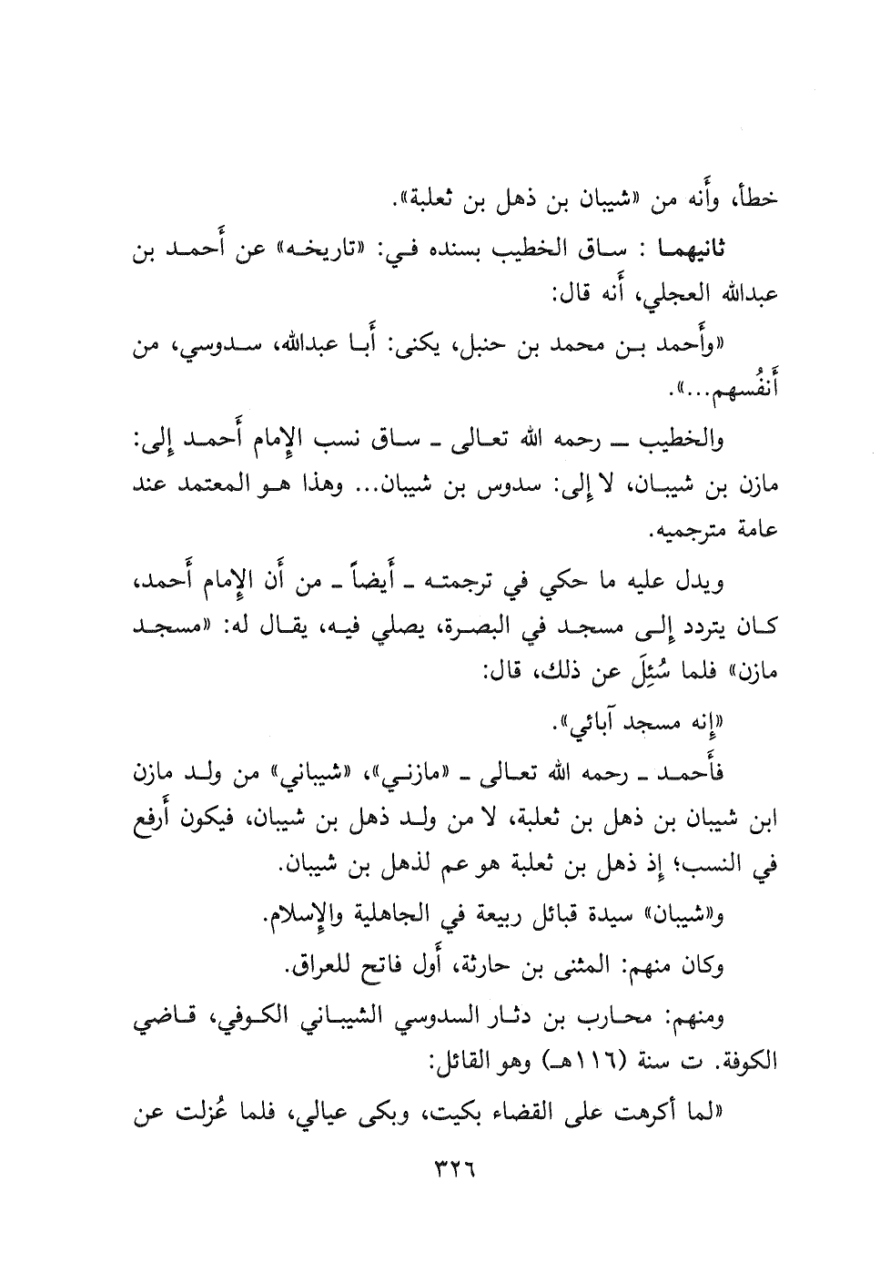ويدل عليه ما حكي في ترجمته- أيضا- من أَن الإمام أَحمد، كان يتردد إلى مسجد في البصرة، يصلي فيه، يقال له: " مسجد مازن " فلما سُئِلَ عن ذلك، قال " إِنه مسجد آبائي ".