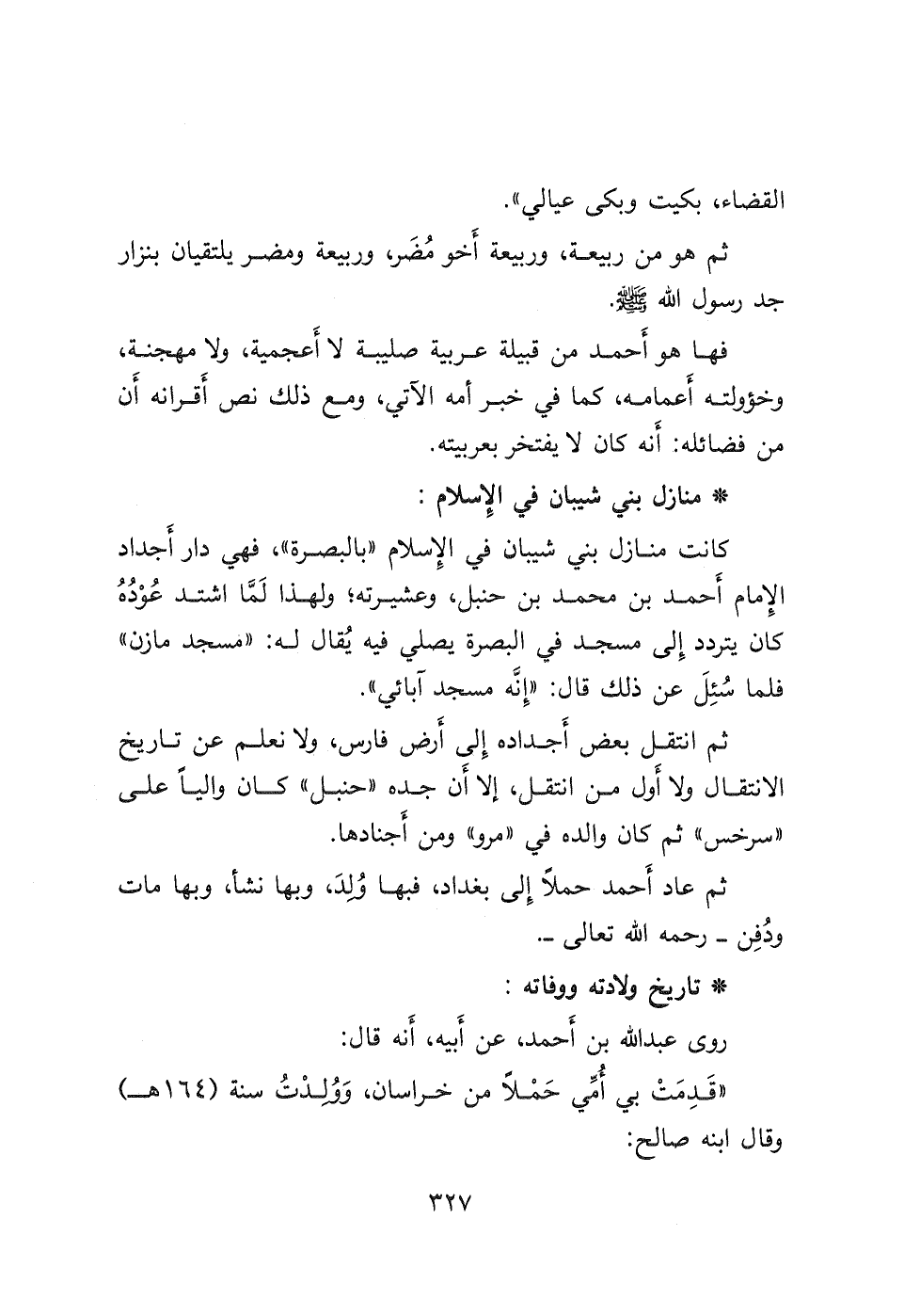 ثم عاد أَحمد حملًا إلى بغداد، فبها وُلدَ، وبها نشأ، وبها مات ودُفِن- رحمه الله تعالى-.