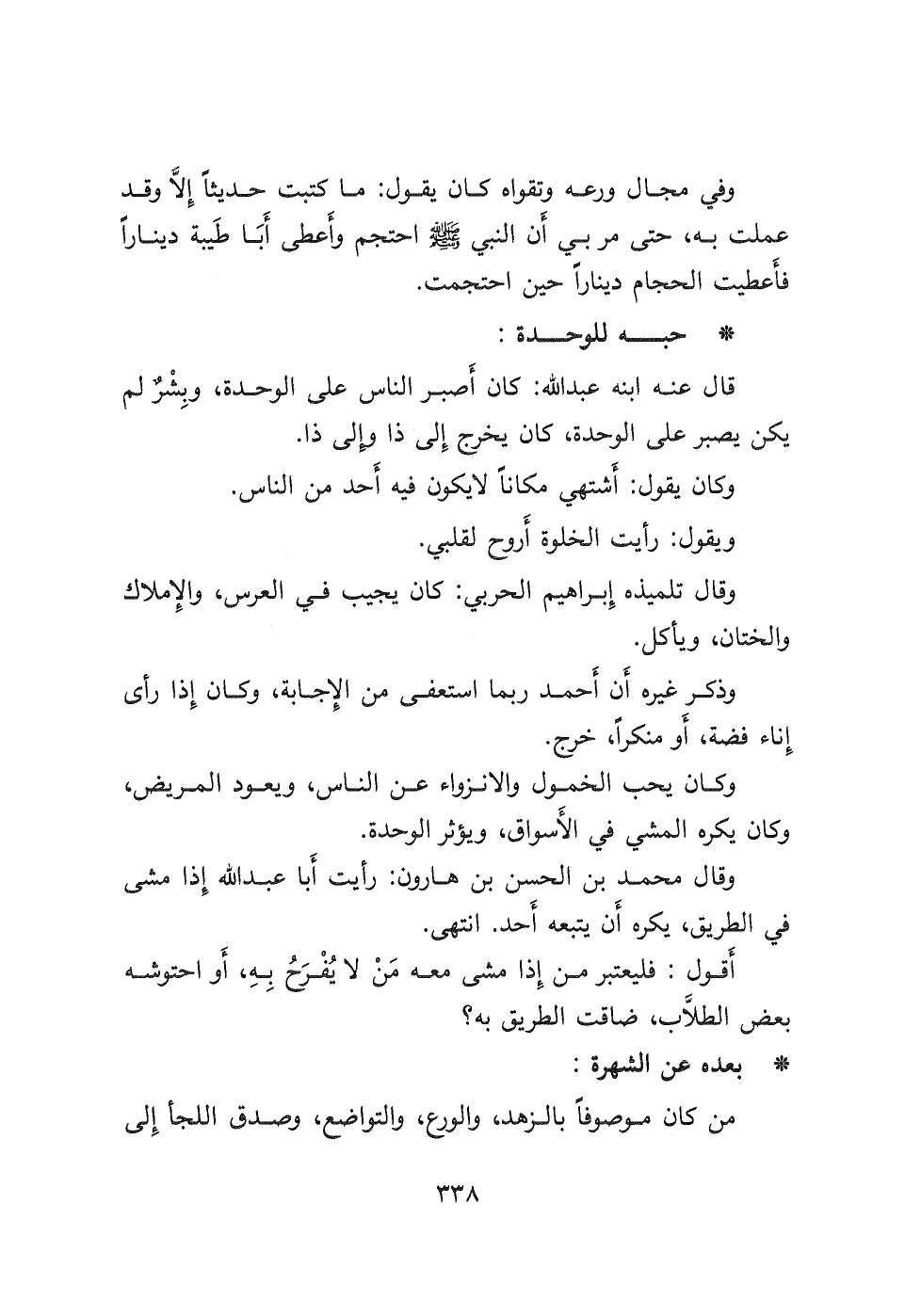 قال عنه ابنه عبد الله: كان أَصبر الناس على الوحدة، وبِشْرٌ لم