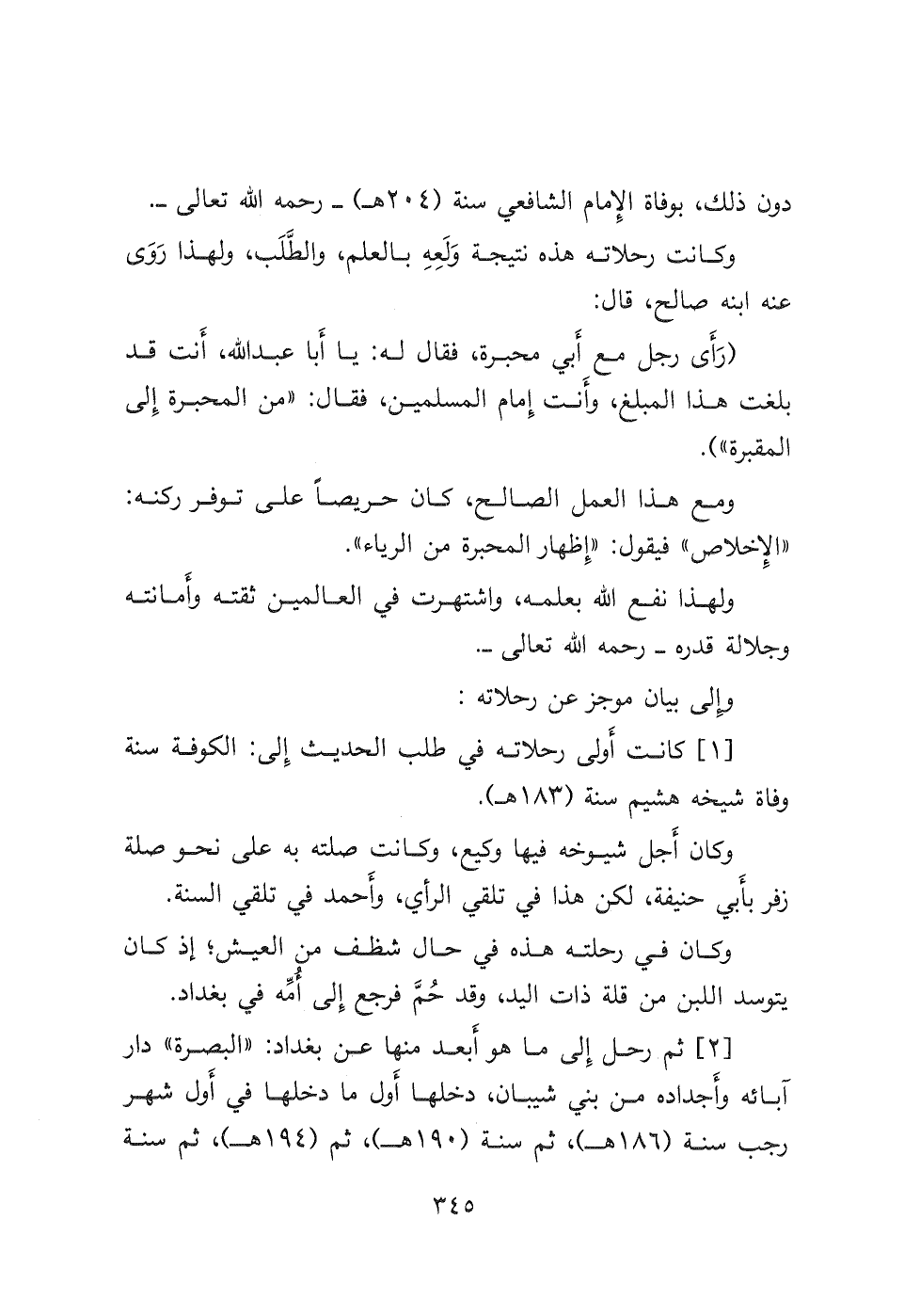 دون ذلك، بوفاة الإمام الشافعي سنة (٢٠٤ هـ) - رحمه الله تعالى-. وكانت رحلاته هذه نتيجة وَلَعِهِ بالعلم، والطَّلَب، ولهذا رَوَى