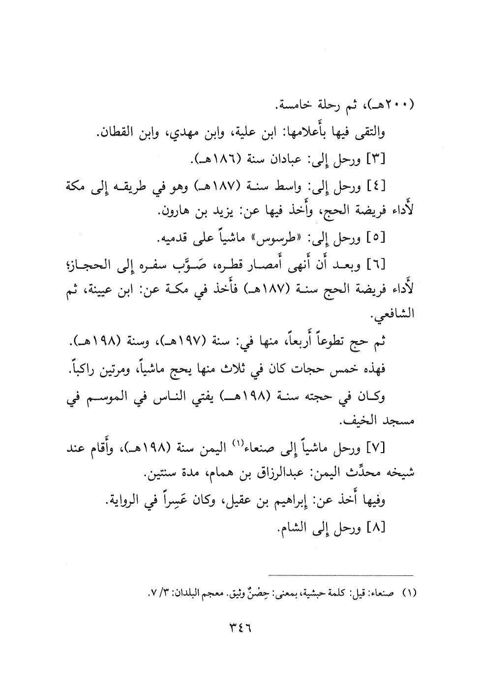 [٧] ورحل ماشيًا إلى صنعاء (١) اليمن سنة (١٩٨ هـ) ، وأَقام عند شيخه محدِّث اليمن: عبد الرزاق بن همام، مدة سنتين