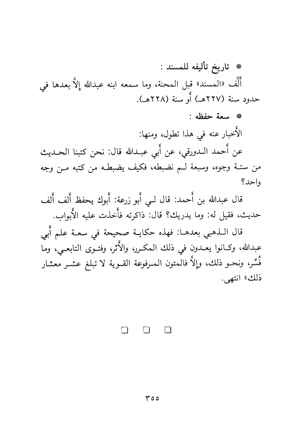 قال عبد الله بن أَحمد: قال لي أَبو زرعة: أَبوك يحفظ أَلف أَلف حديث، فقيل له: وما يدريك؟ قال: ذاكرته فأخذت عليه الأَبواب. قال الذهبي بعدها: فهذه حكاية صحيحة في سعة علم أَبي عبد الله، وكانوا يعدون في ذلك المكرر، والأَثر، وفتوى التابعي، وما فُسِّر، ونحو ذلك، وإلاَّ فالمتون المرفوعة القوية لا تبلغ عشر معشار ذلك " انتهى.