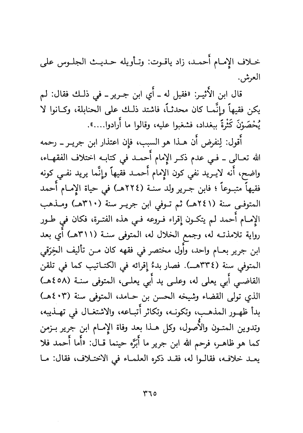 خلاف الإمام أحمد، زاد ياقوت: وتأويله حديث الجلوس على العرش.