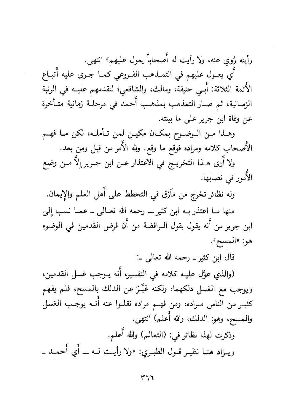 منها ما أعتذر به ابن كثير- رحمه الله تعالى- عما نسب إلى ابن جرير من أَنه يقول بقول الرافضة من أَن فرض القدمين في الوضوء هو " المسح ".